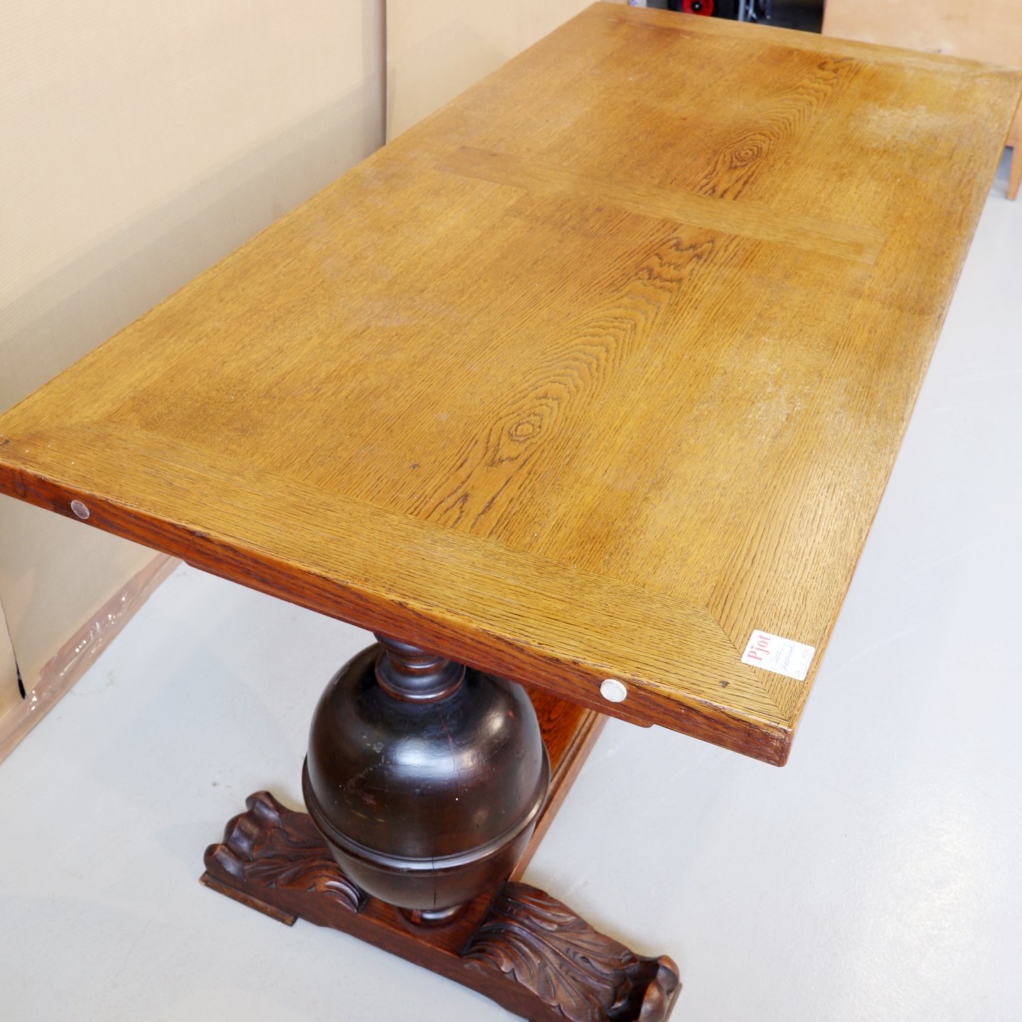 Skrivebord i bejdset, fineret og lakeret egetræ m. skuffe, i renæssancestil, OBS den ene kugle er revnet, fra 1930erne. Højde 78cm Bredde 160cm Dybde 80cm Emne nummer: 42709
