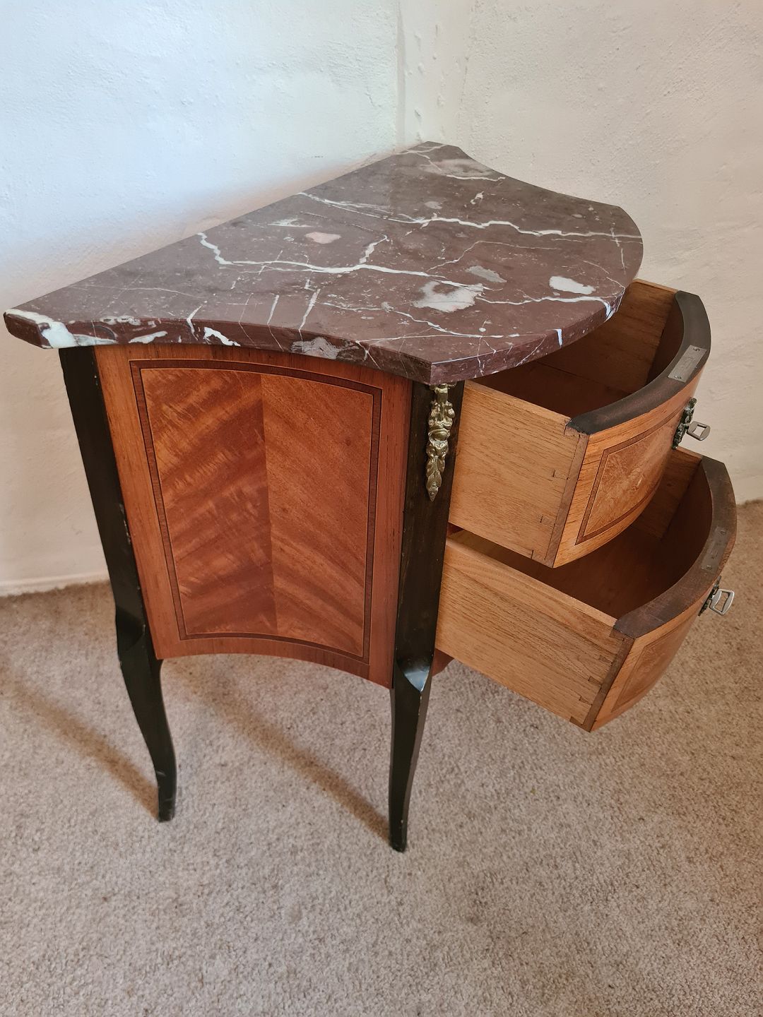 Kommode fra 1950'erne i finéret mahogni med marmor plade. Fremstår pæn og velholdt uden de store brugsspor. Dog mangler messingsko på venstre forben. (Billede) Højde 73 cm. Bredde 68 cm. Dybde 38 cm. Emne nummer: 80898