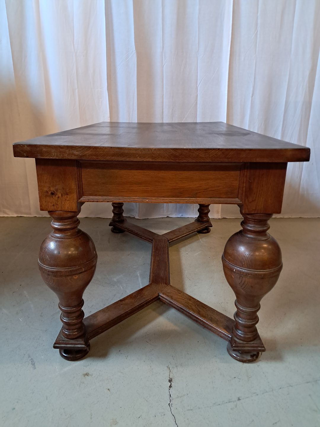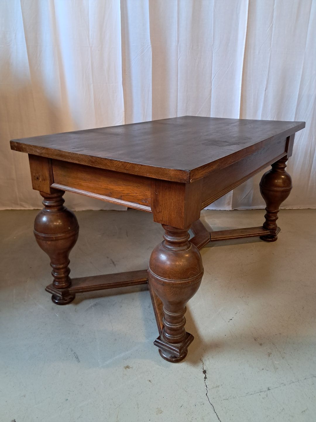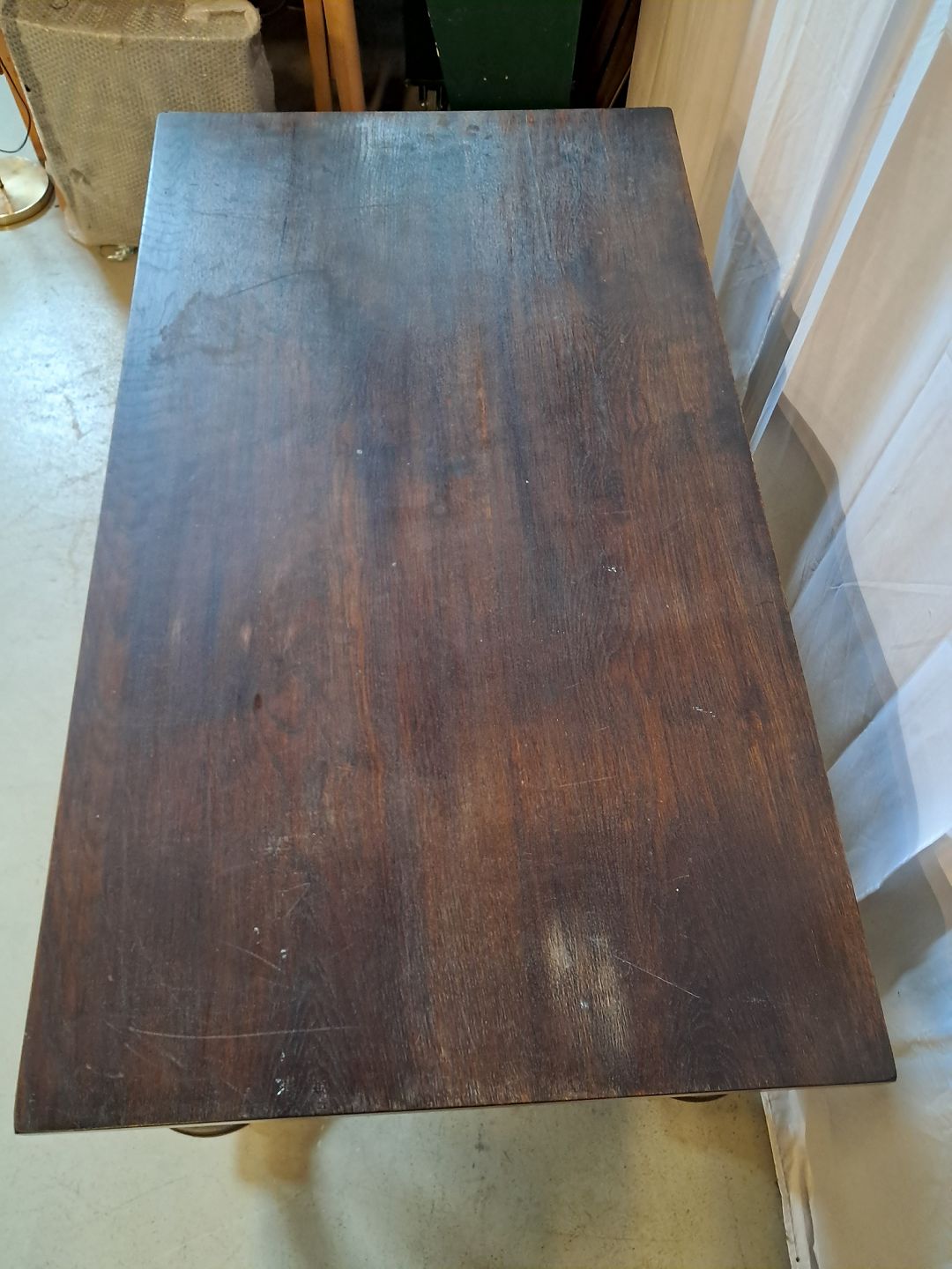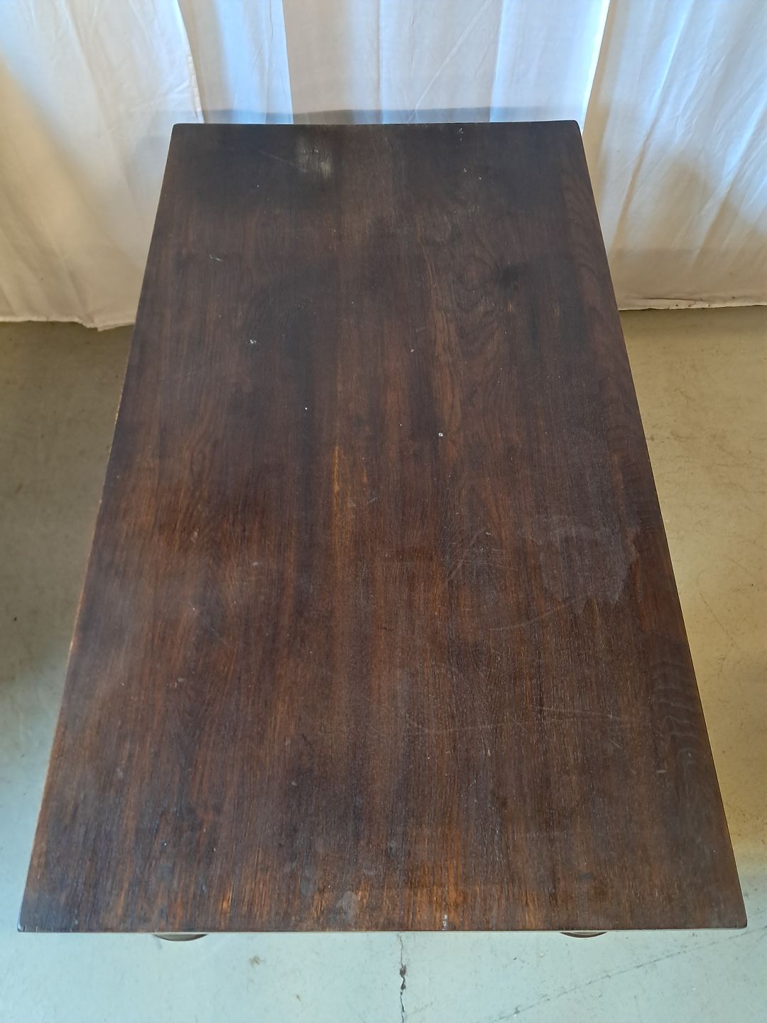 Bord i fineret egetræ, fra 1930erne. Det har brugsspor. Højde 76cm Bredde 82cm Længde 145cm Emne nummer: 76999