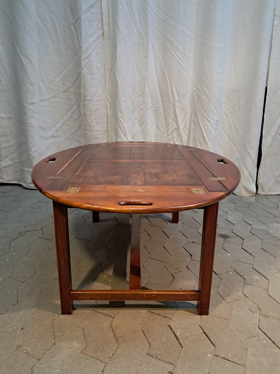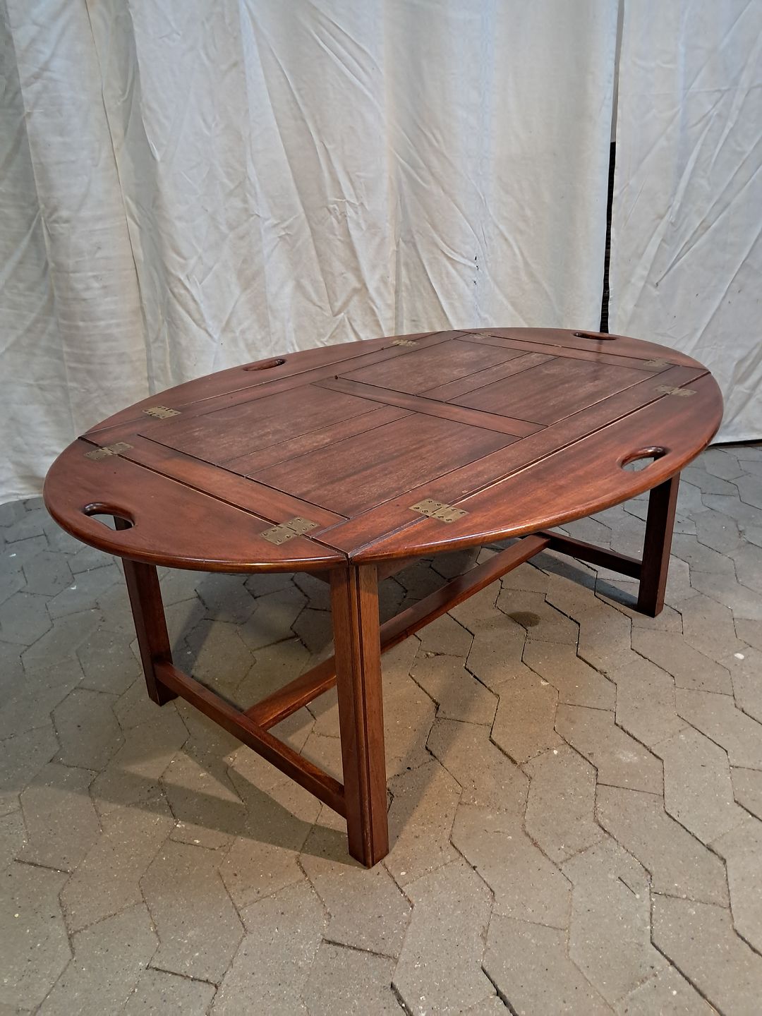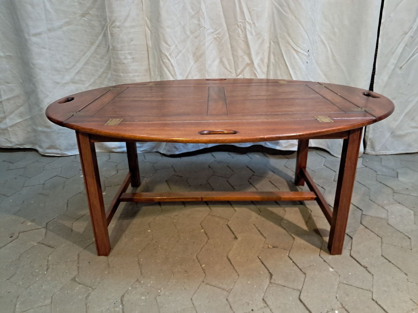 Butlers tray i fineret og massivt mahogni, fra 1980erne. Det har brugsspor. Højde 50cm Bredde 88cm Længde 120cm Emne nummer: 91906