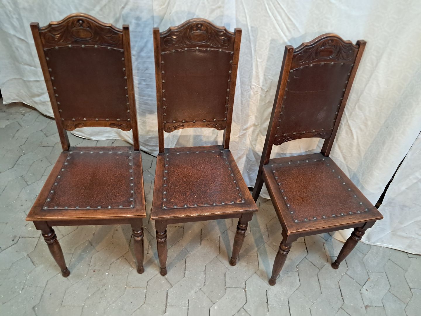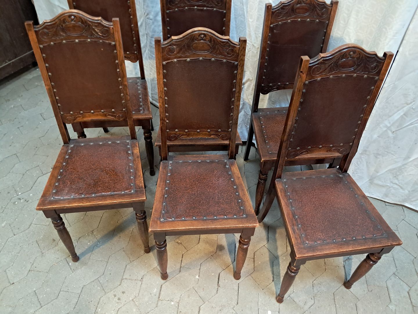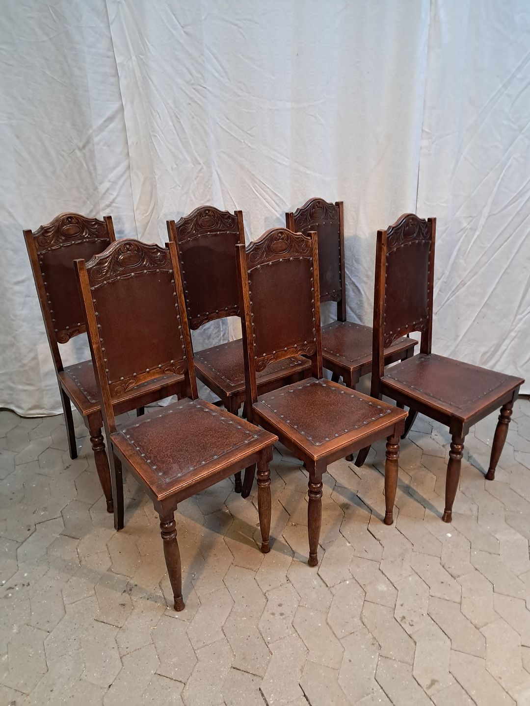 6 Stole i massivt egetræ, fra 1920erne. De har brugsspor. Ryghøjde 105cm Sædehøjde 47cm Emne nummer: 91912