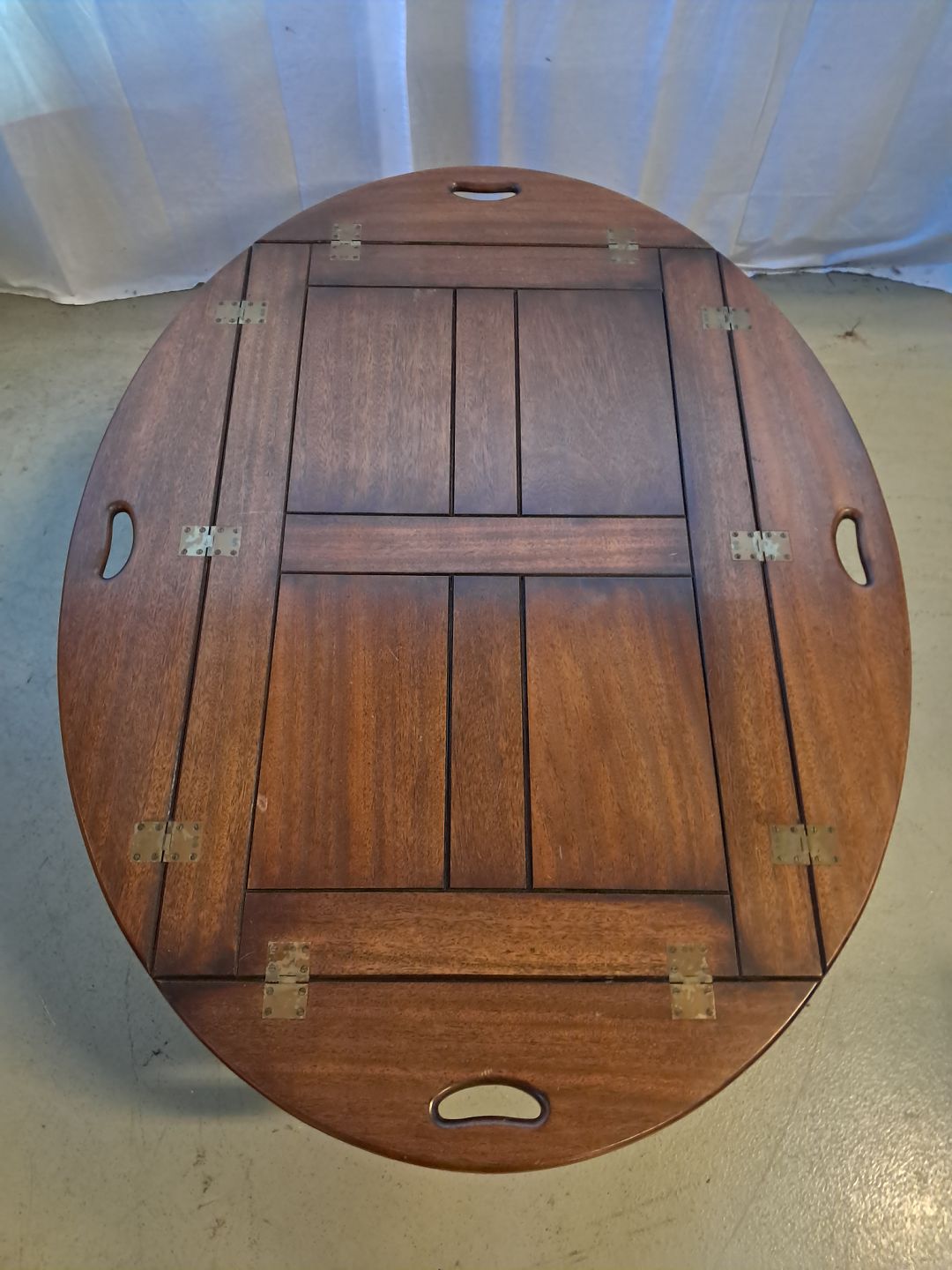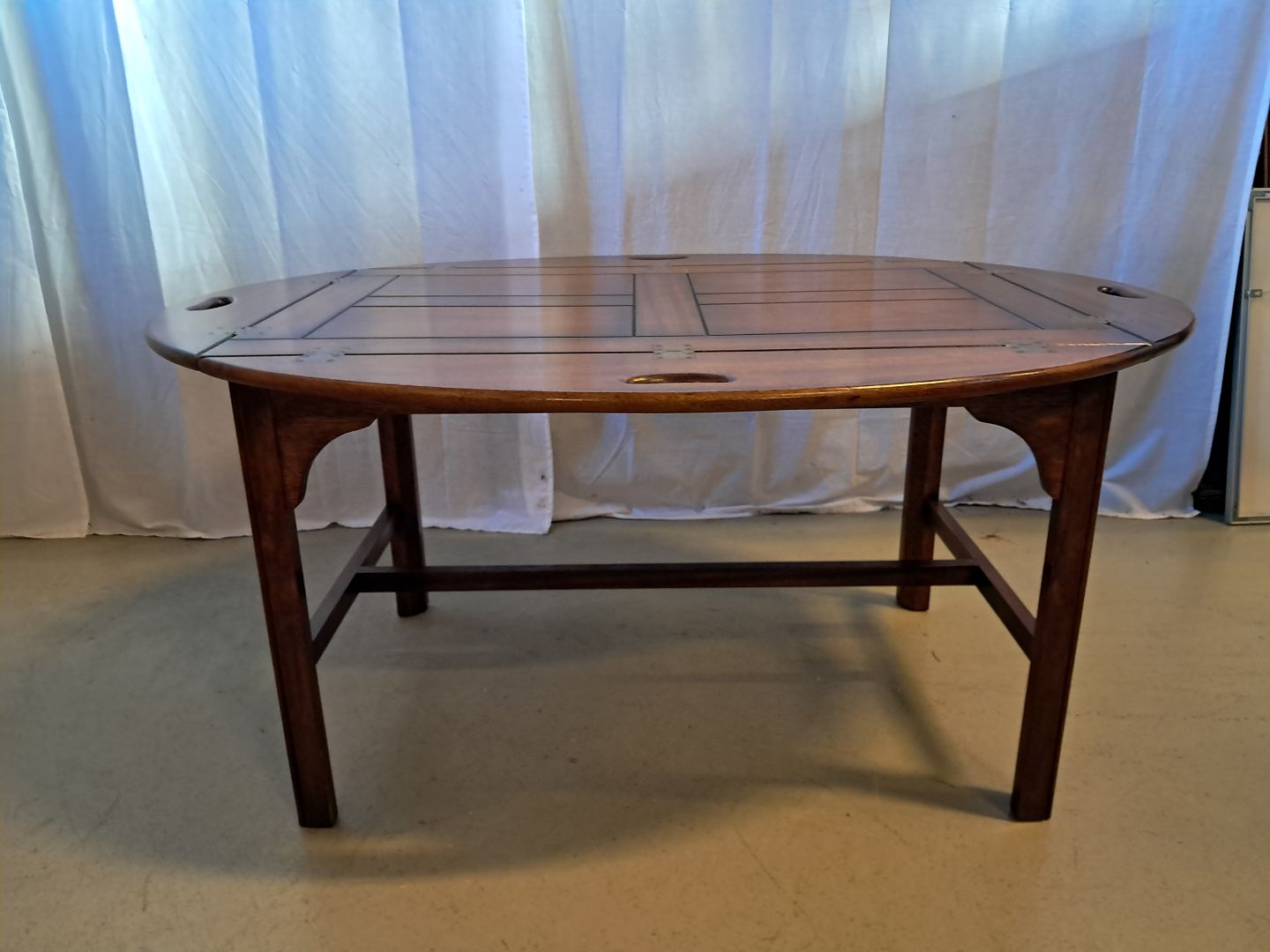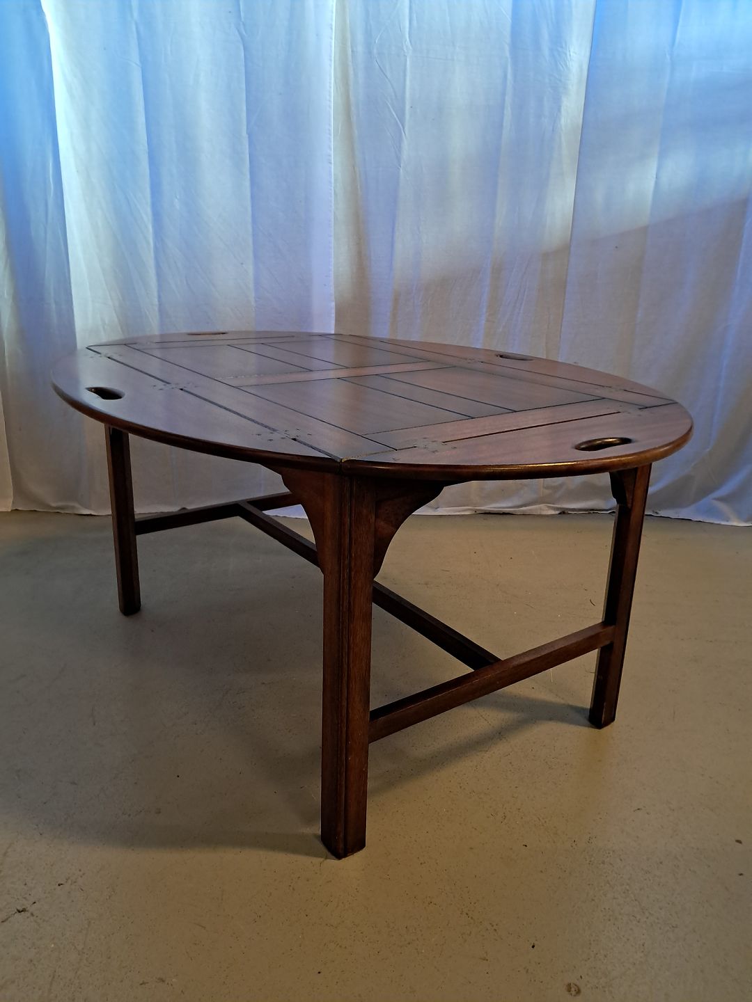 Sofabord i massivt og fineret mahogni, fra 1980erne. Det har små brugsspor. Højde 55cm Bredde 90cm Længde 120cm Emne nummer: 77230