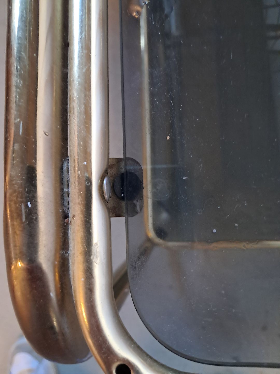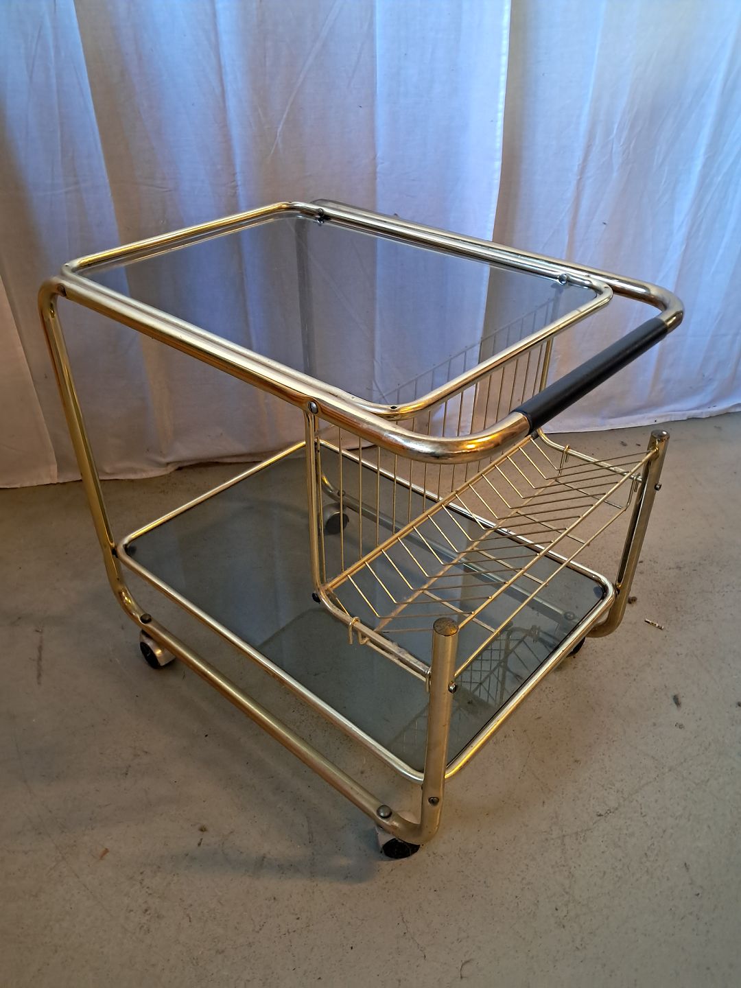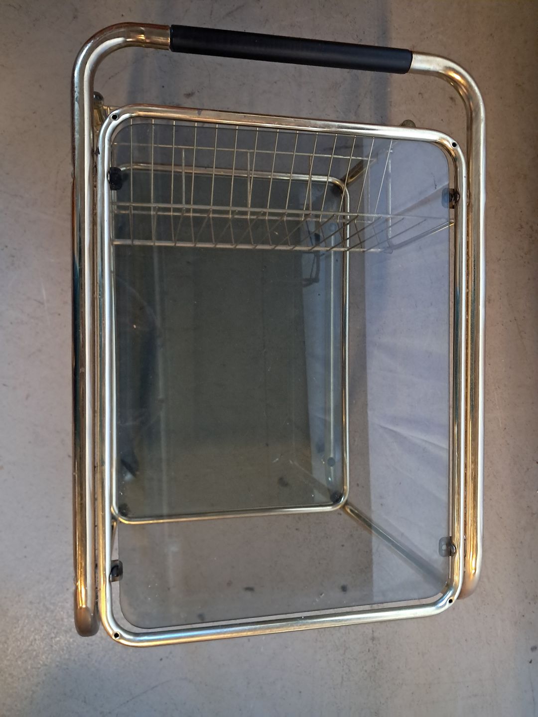 Rullebord i metal og glas, fra 1990erne. Det har brugsspor og mangler en gummi dut.(se foto) Højde 60cm Bredde 45cm Længde 64cm Emne nummer: 77253