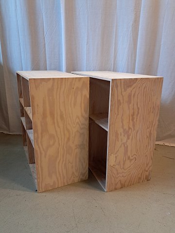 2 Reolkasser i krydsfiner, fra 2000erne. De har brugsspor og der medfølger ikke ophæng. Højde 70cm Bredde 35,5cm Dybde 30cm Emne nummer: 77259
