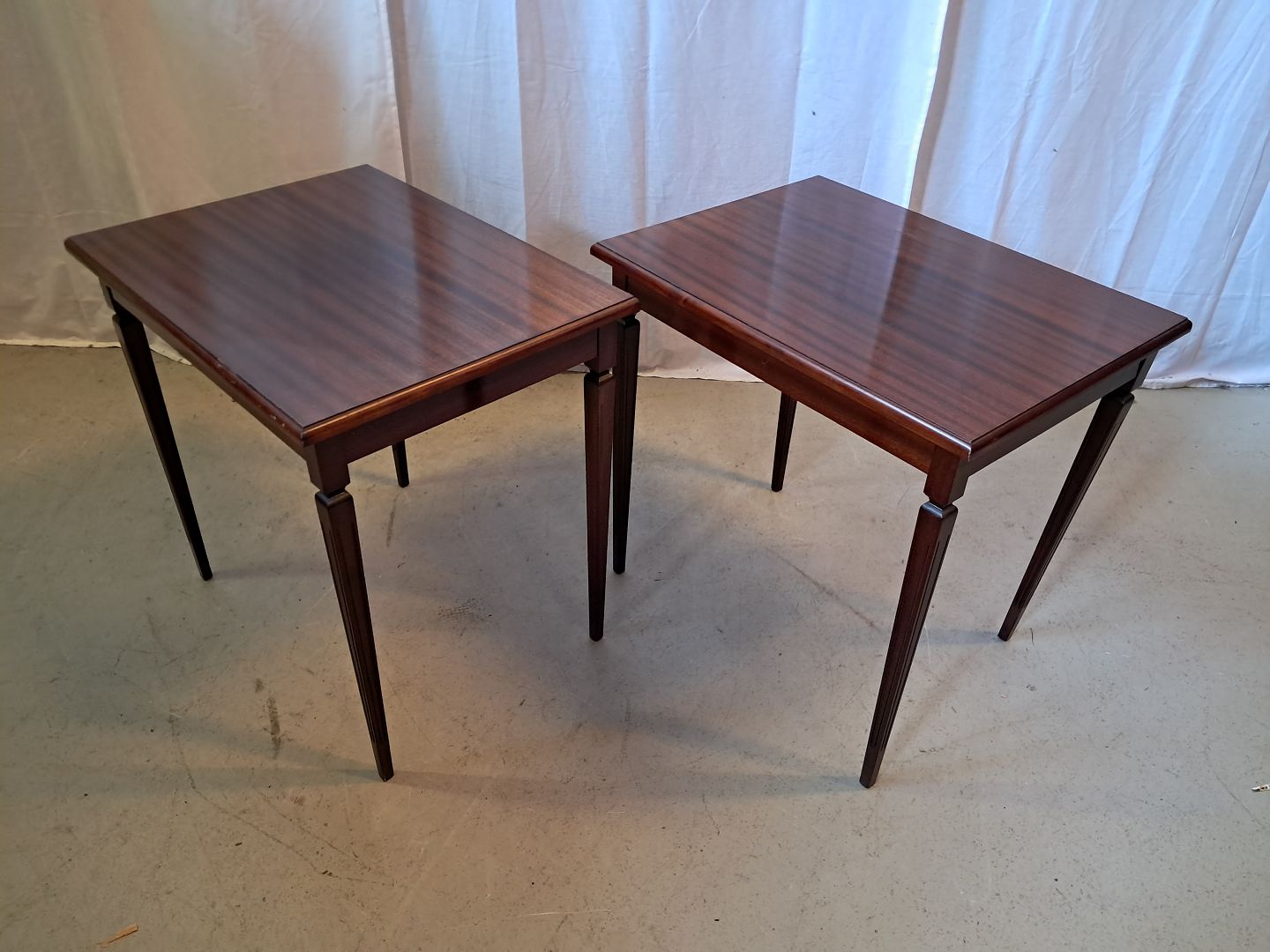 2 Sideborde i fineret mahogni, fra 1980erne. De har brugsspor. Højde 53cm Bredde 40cm Længde 54cm Emne nummer: 77277