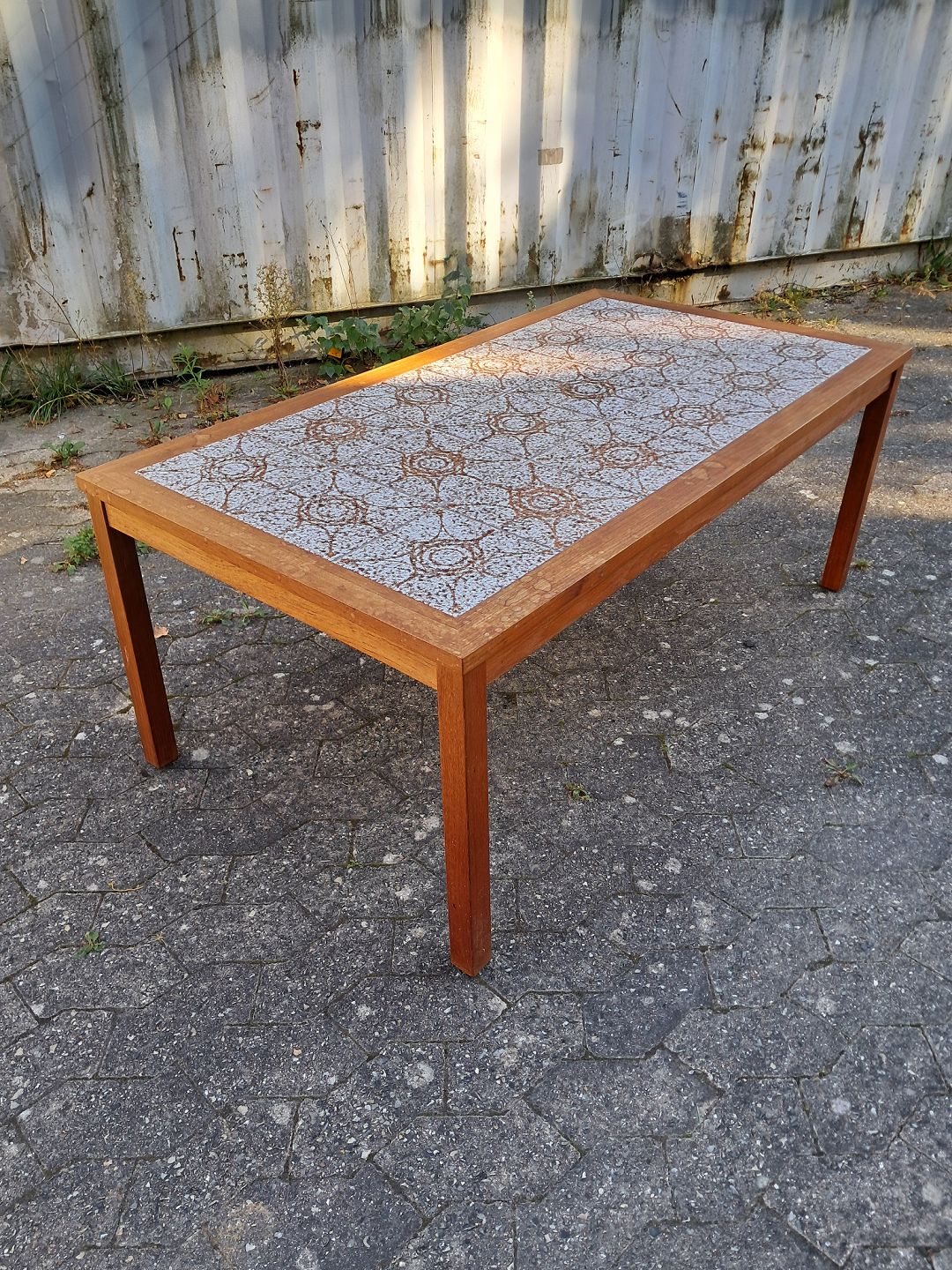 Sofabord i fineret teaktræ med kakler, fra 1960erne. Det har brugsspor. Højde 53cm Bredde 72cm Længde 133cm Emne nummer: 77280