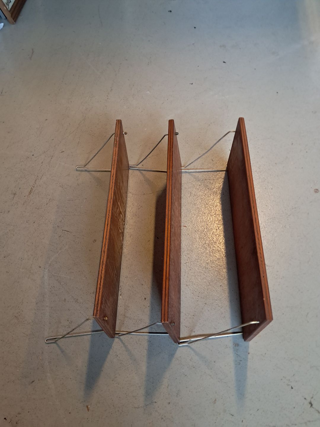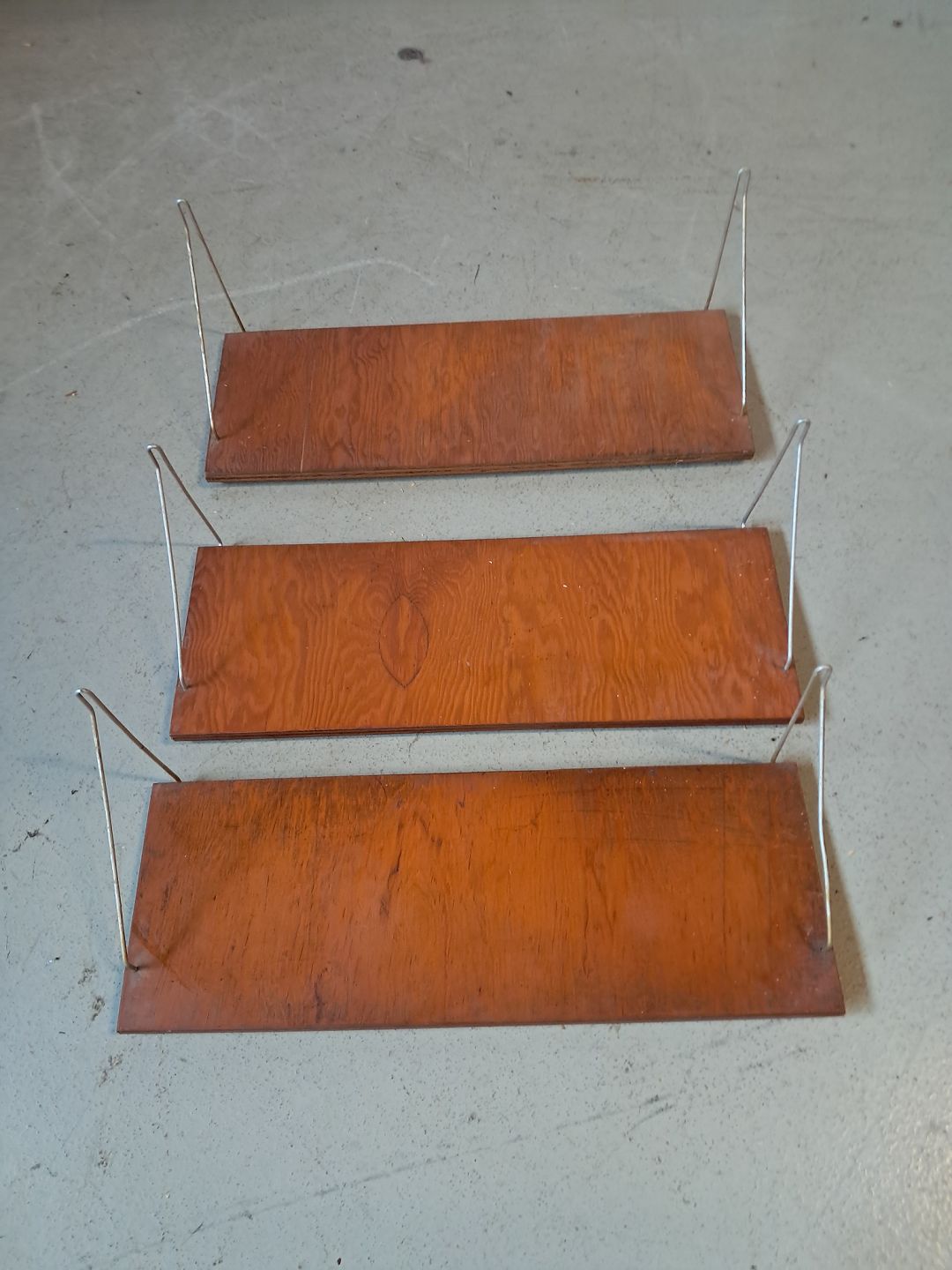 3 Hylder i fkrydsfiner, fra 1960erne. De har brugsspor. Højde 20cm Bredde 60cm Dybde 23cm Emne nummer: 77294