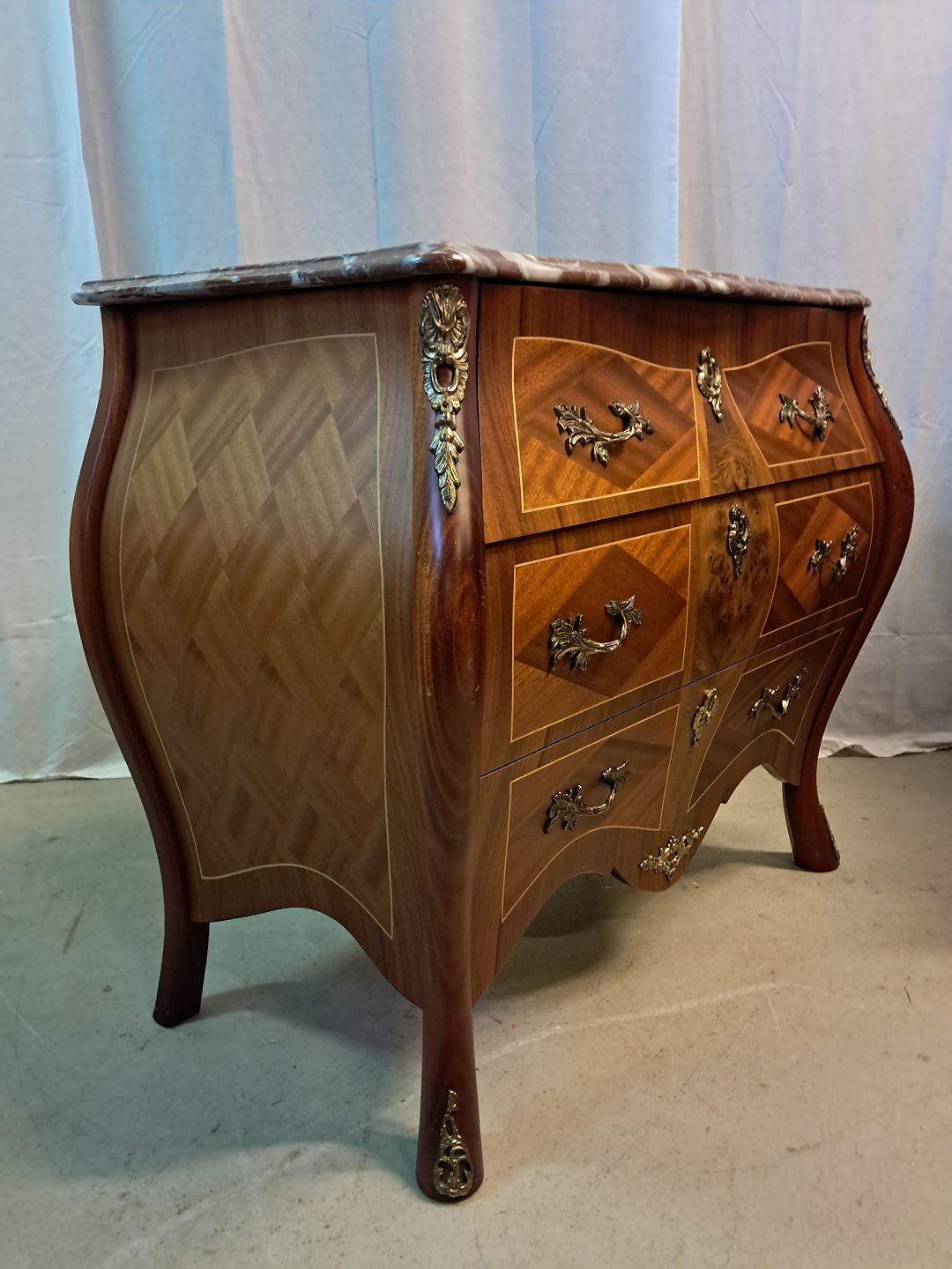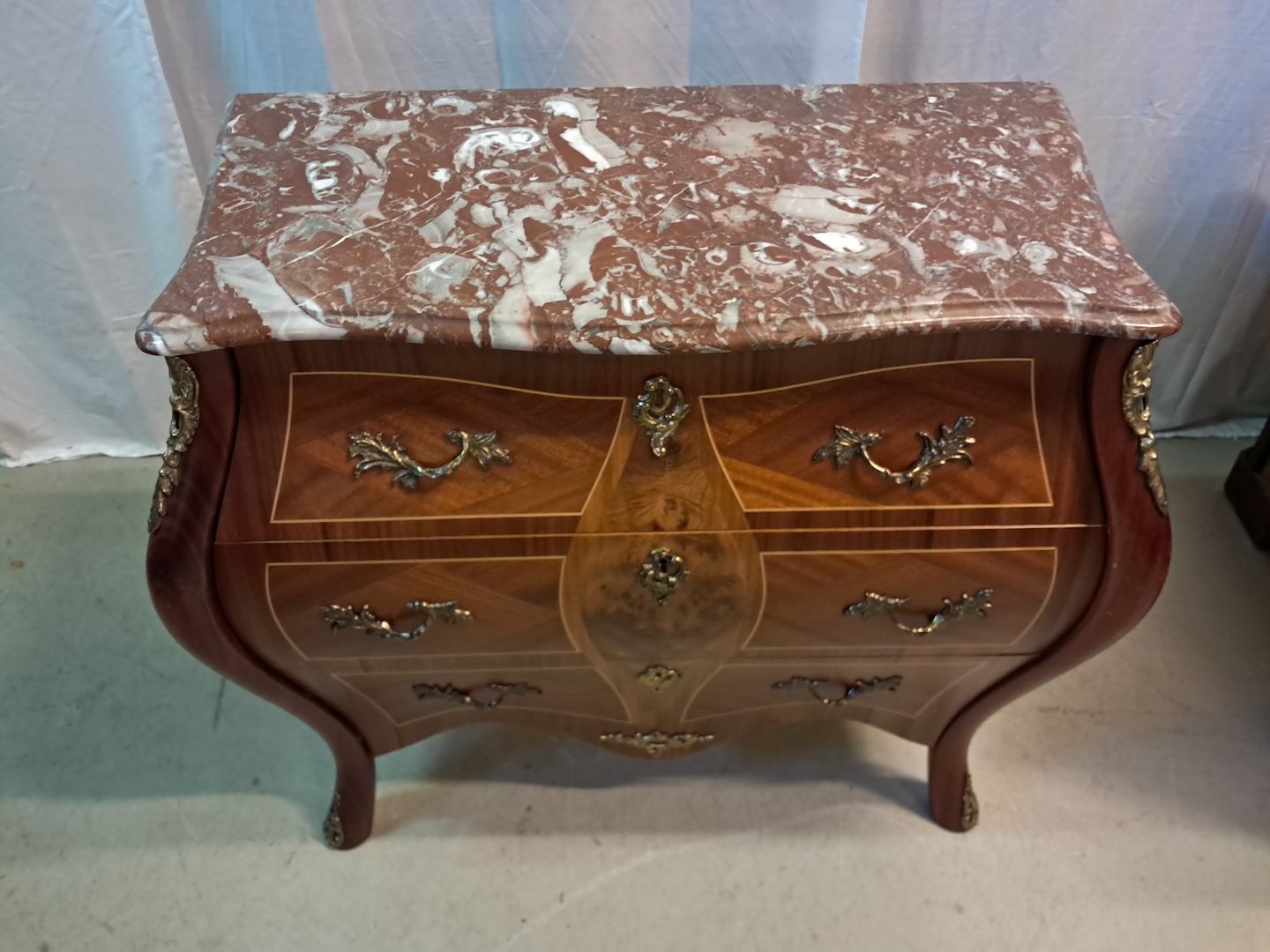 Kommode i fineret mahogni med marmorplade, fra 1980erne. Den har brugsspor. Højde 74cm Bredde 85cm Dybde 42cm Emne nummer: 77295