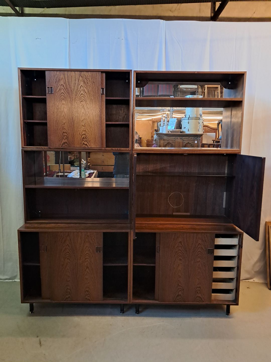 2 Reolsektioner i fineret palisander, fra 1960erne. De har brugsspor. Højde 192cm Bredde 86cm Dybde 42cm og 28cm Emne nummer: 77307