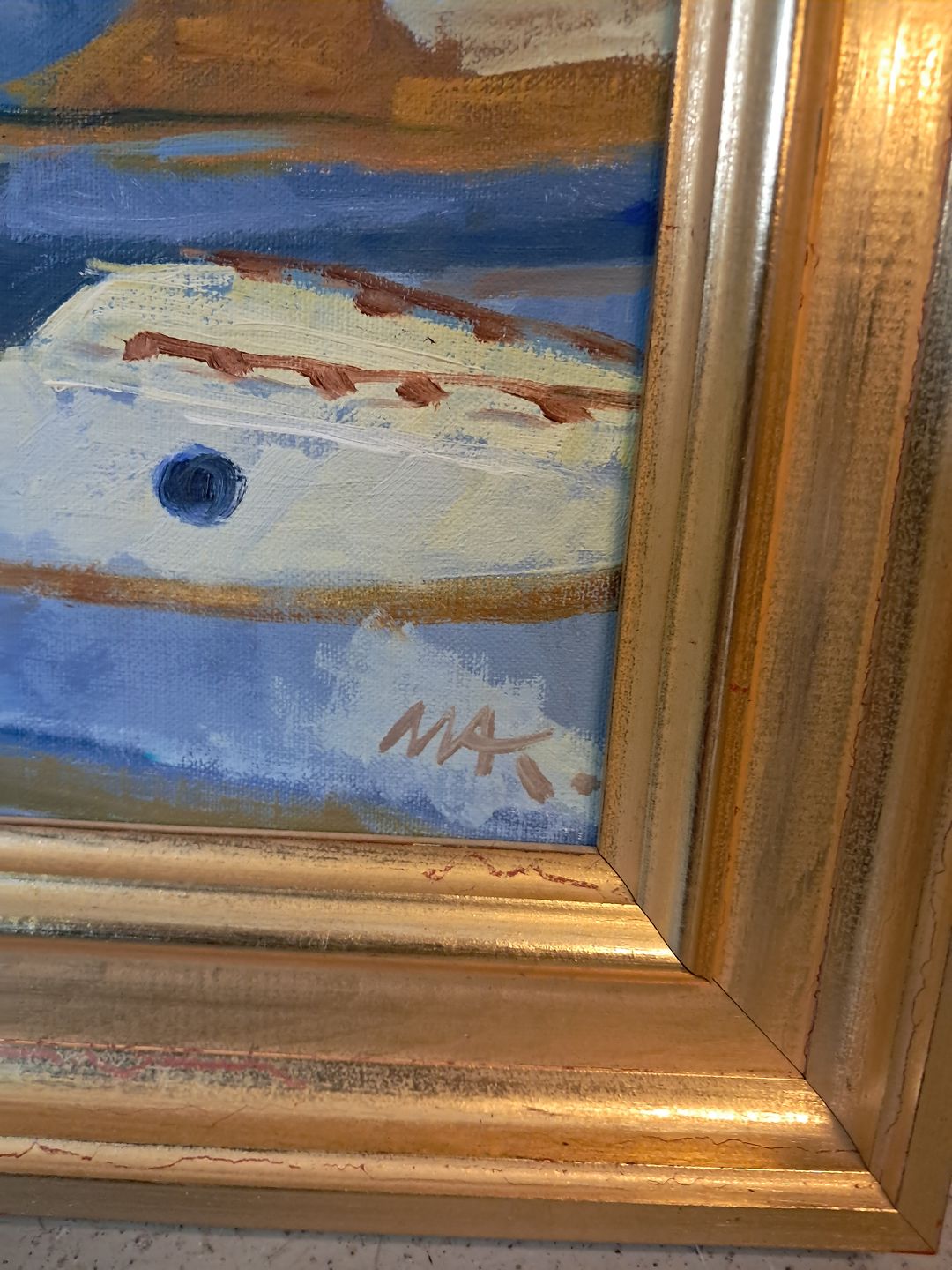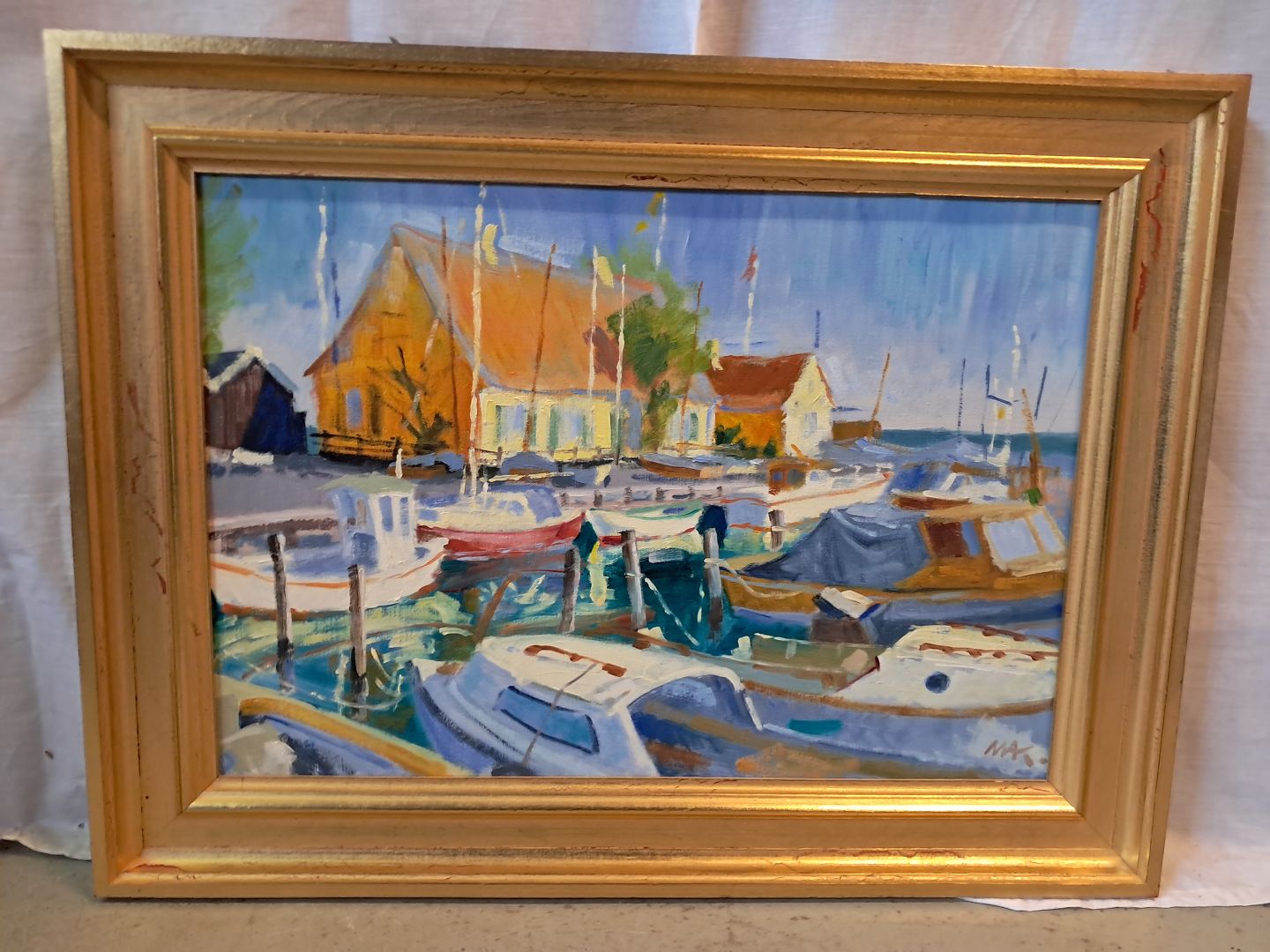 Maleri af Dragør Havn i guldmalet ramme, af : Mogens Amdi Thorsen (1924-2016) Det har brugsspor. Højde 46cm Bredde 61cm Emne nummer: 77331