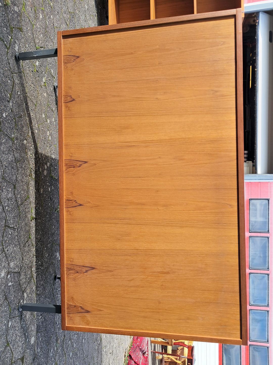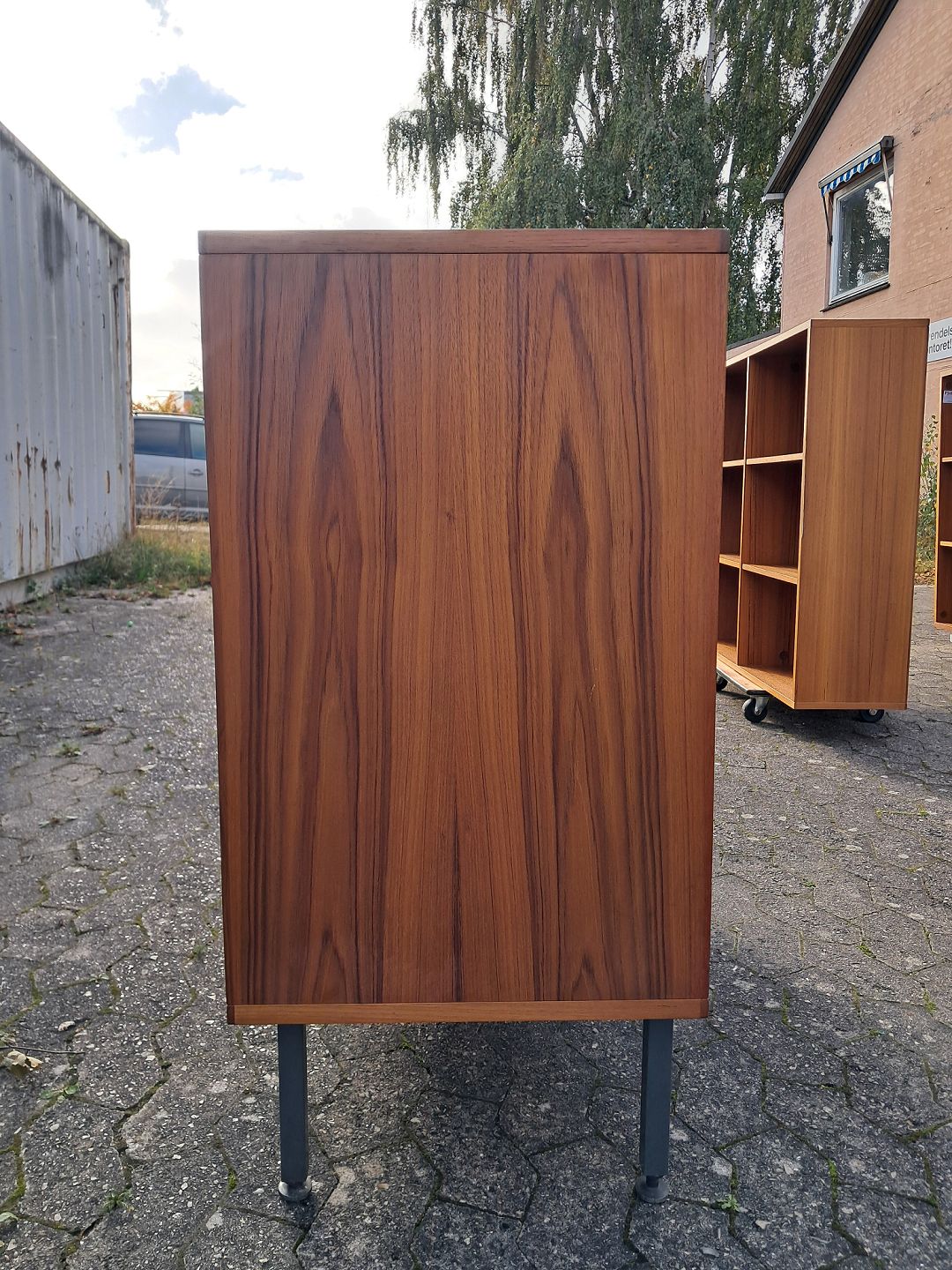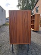 Jalousi skab i fineret teaktræ, fra 1970erne. Det har brugsspor og der medfølger en nøgle. Højde 93cm Bredde 120cm Dybde 43cm Emne nummer: 77346