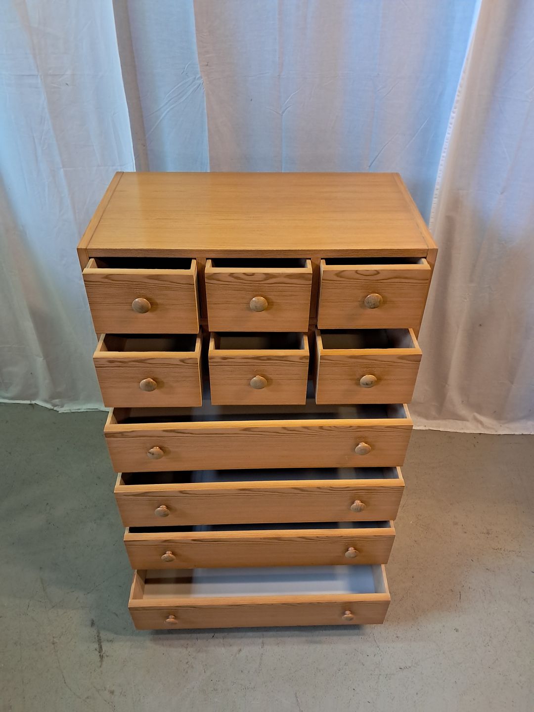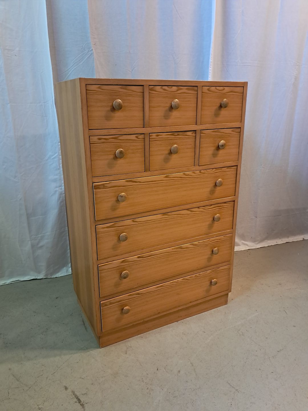 Kommode i fineret fyrretræ, fra 1980erne. Den har brugsspor. Højde 107cm Bredde 70cm Dybde 39cm Emne nummer: 77383
