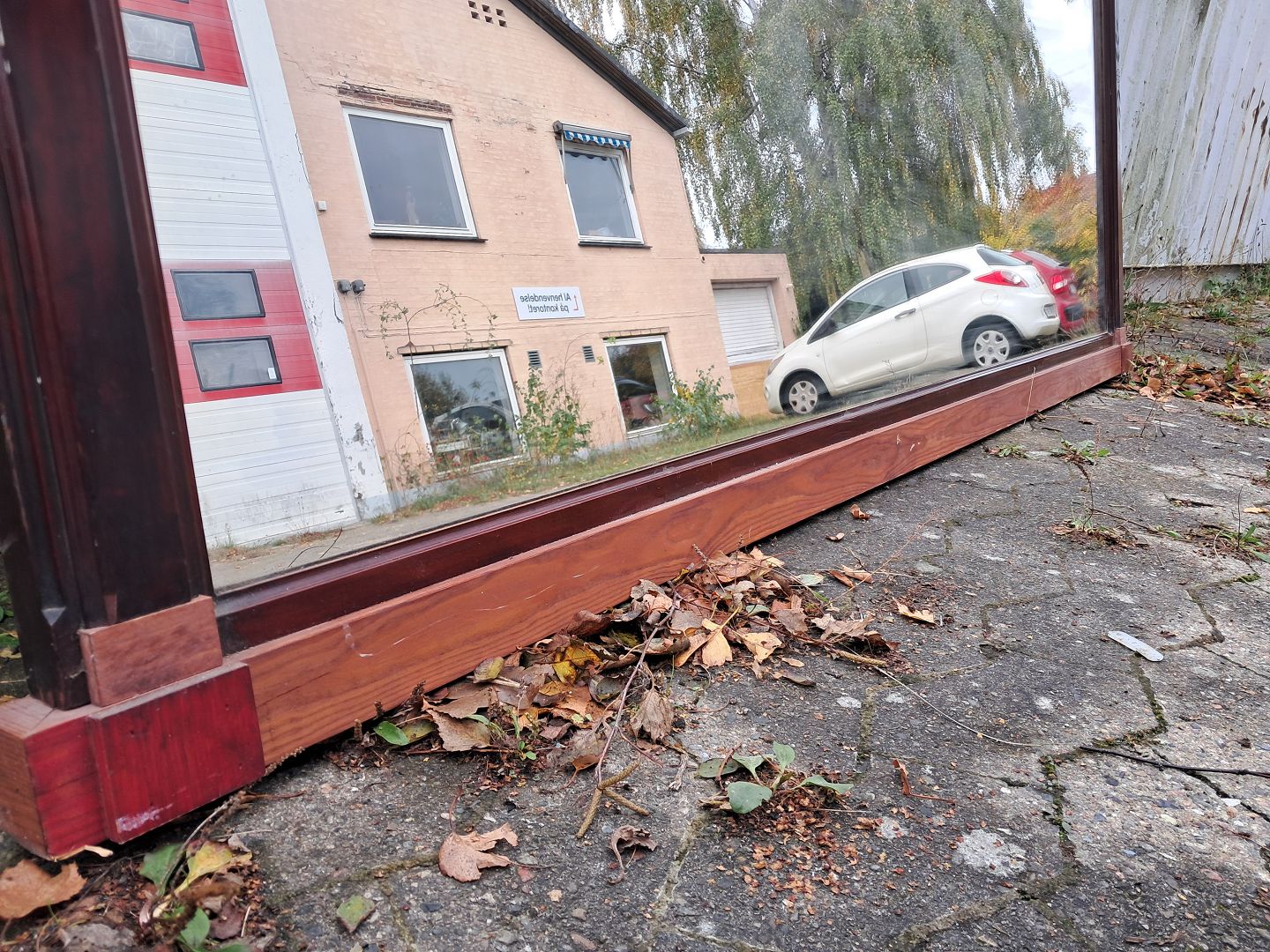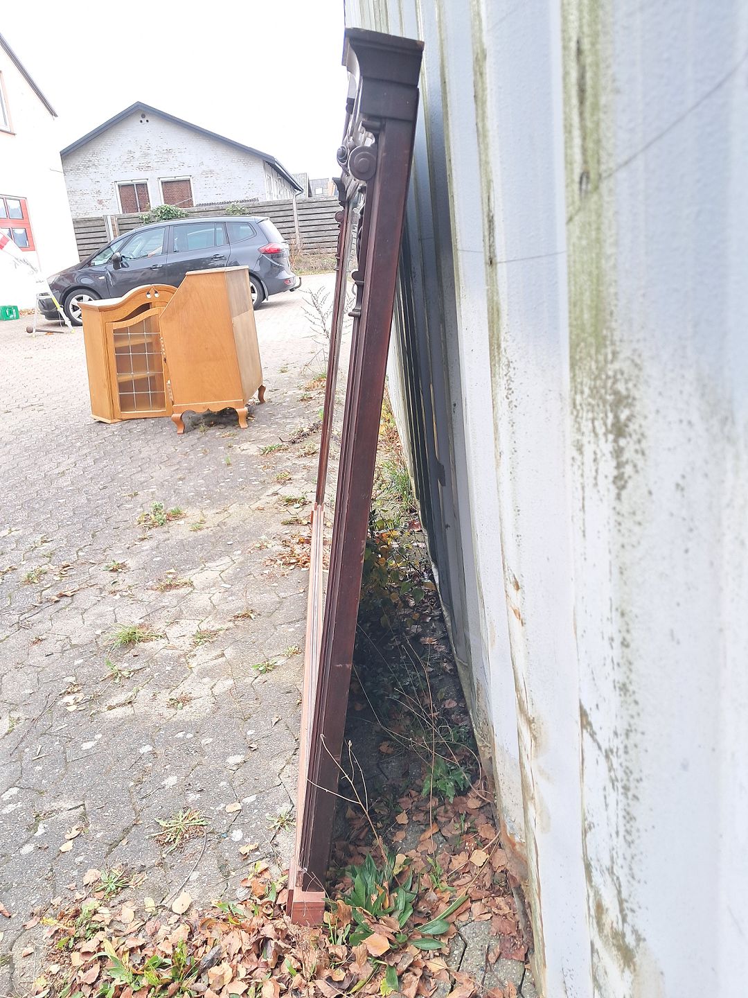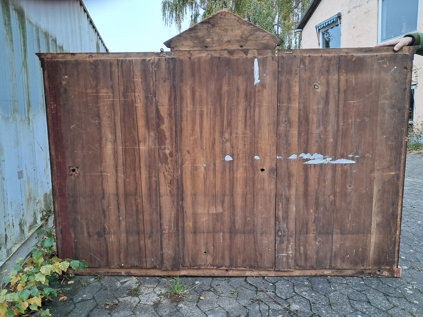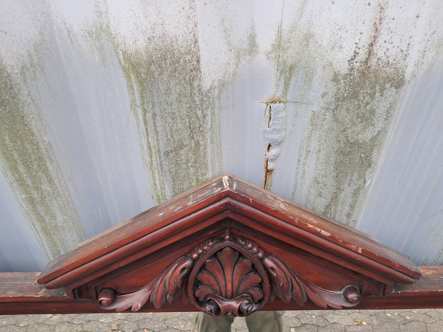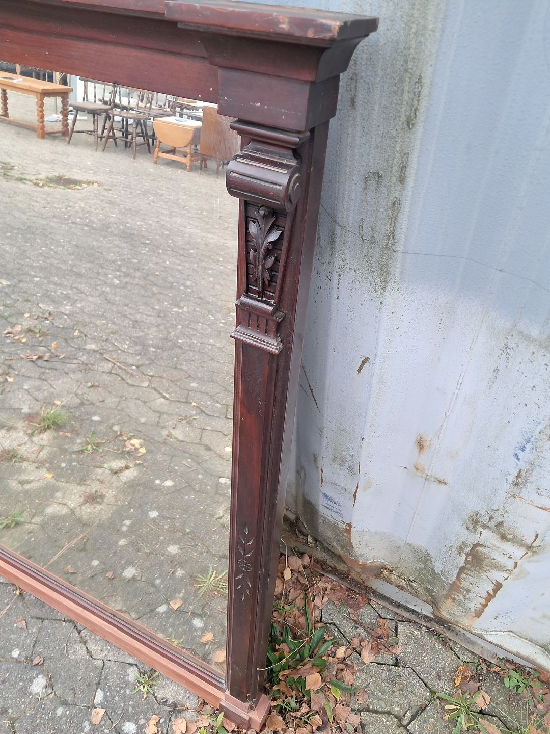 Kæmpe spejl i fineret mahogni, fra 1910erne. Det har brugsspor og finer defekter. Højde 152cm Bredde 209cm Dybde 10cm Emne nummer: 77402