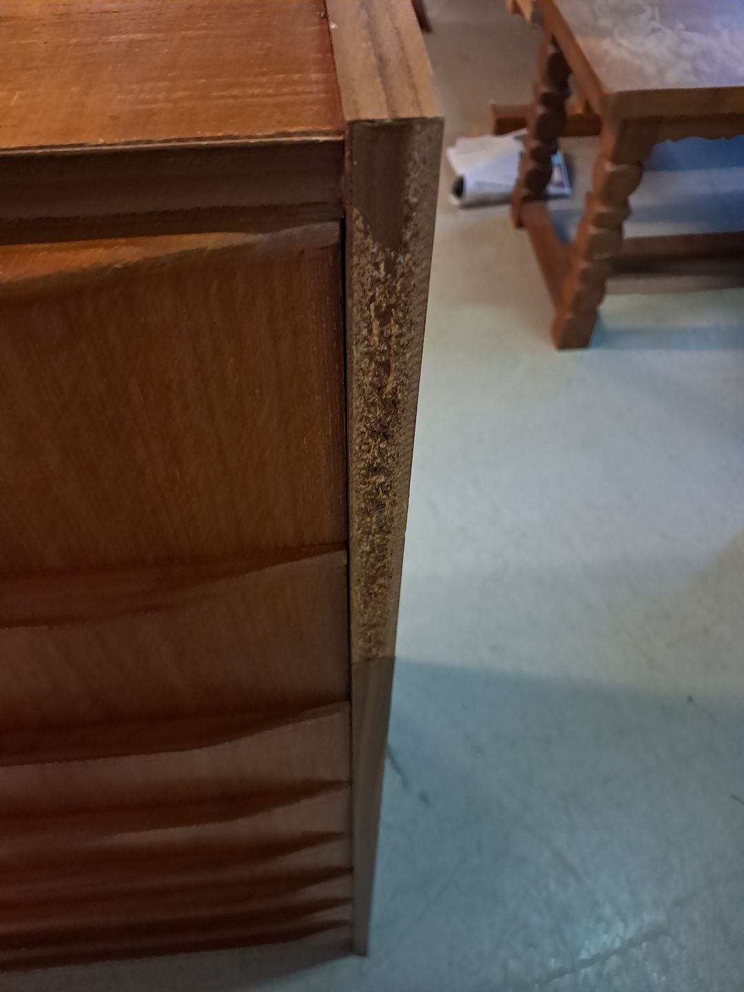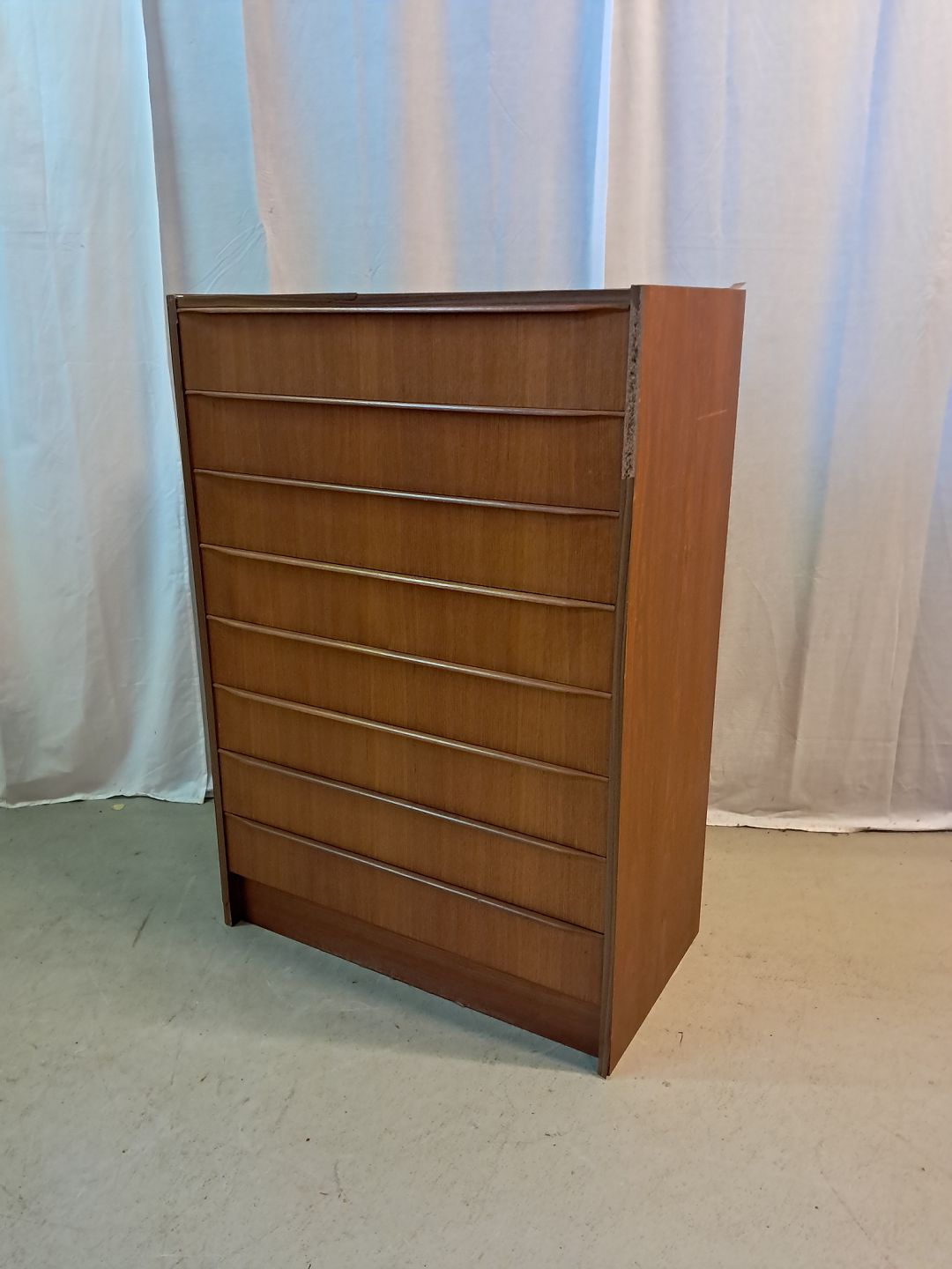 Kommode i fineret teaktræ, fra 1960erne. Den har brugsspor og defekte plast kantlister/bånd. Højde 110cm Bredde 76cm Dybde 41cm Emne nummer: 77407
