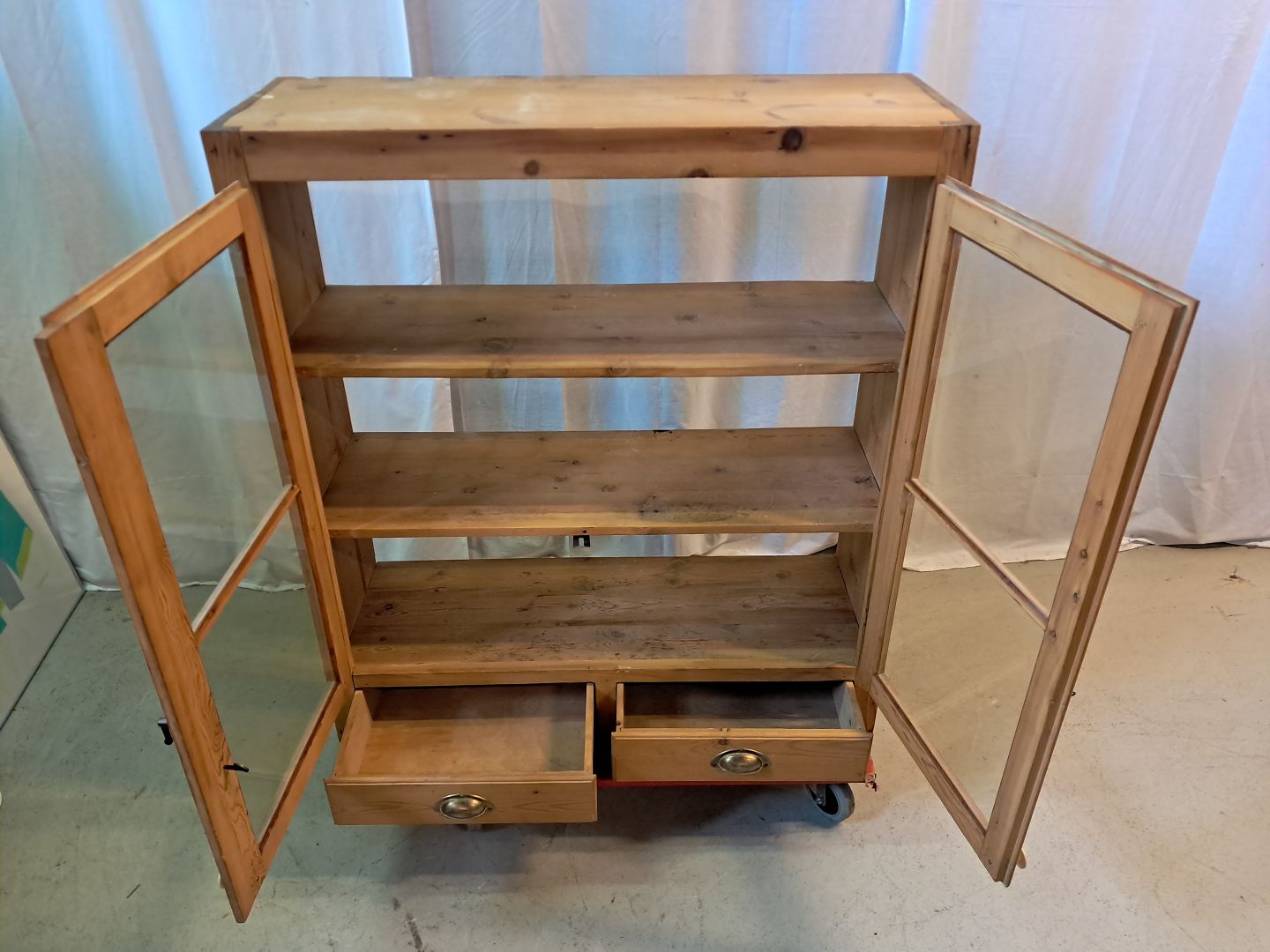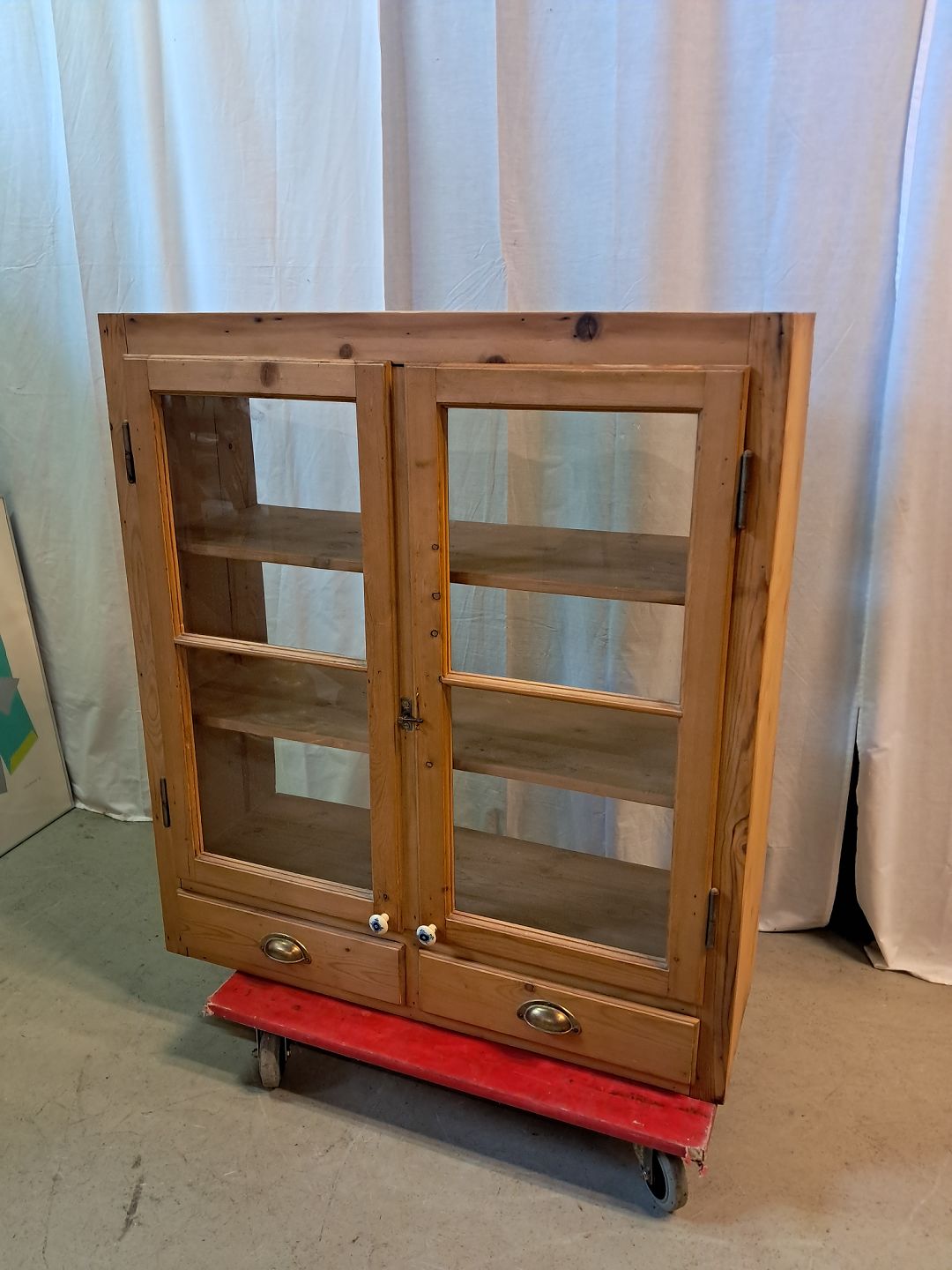 Gammelt køkkenskab i massivt fyrretræ, fra 1920erne. Det har brugsspor. Højde 100cm Bredde 90cm Dybde 32cm Emne nummer: 77414