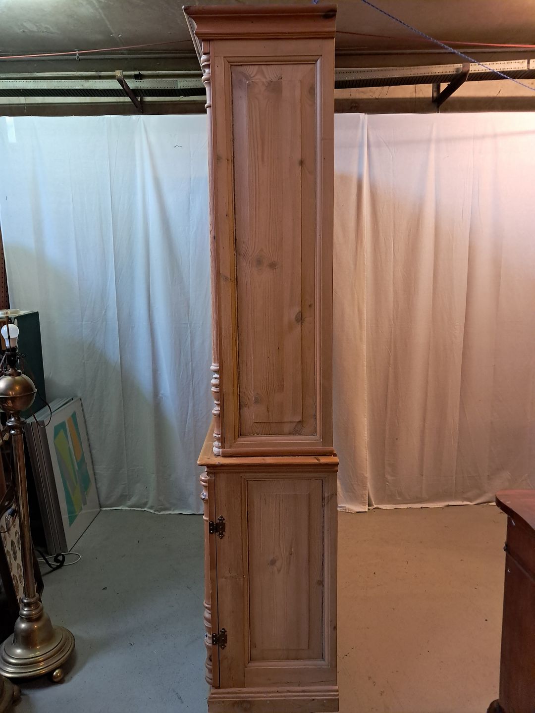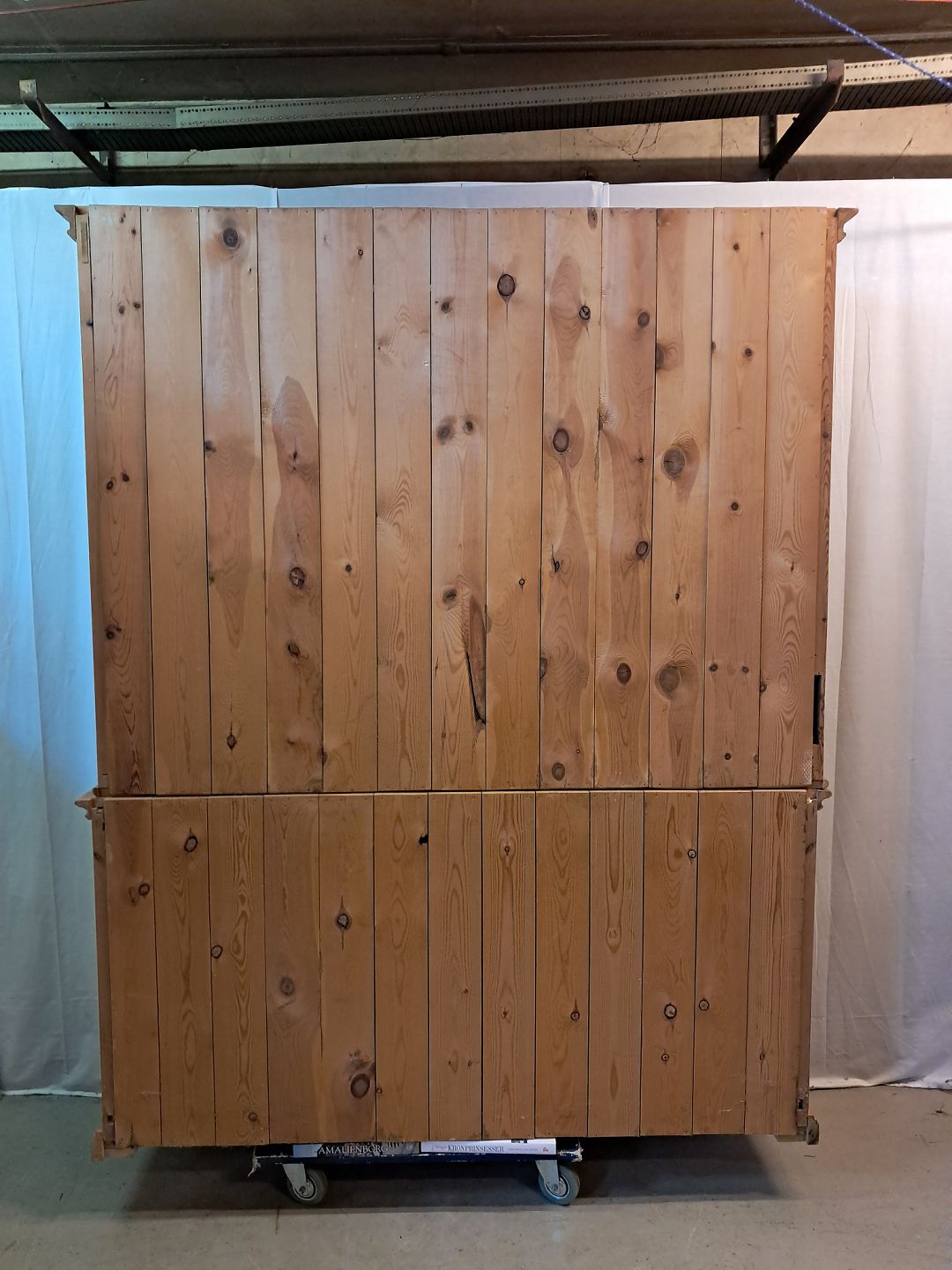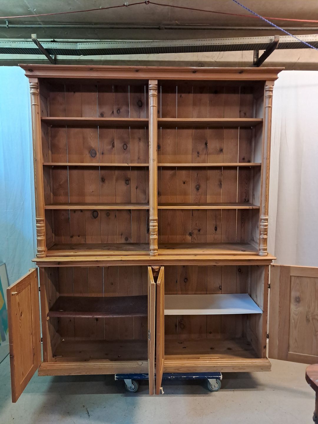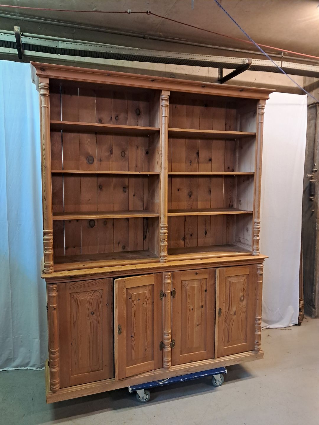 Skab med reol overdel i massivt fyrretræ, fra 1980erne. Det har brugsspor og lågerne gaber en lille smule. Højde 212cm Bredde 167cm Dybde 42cm Emne nummer: 77431