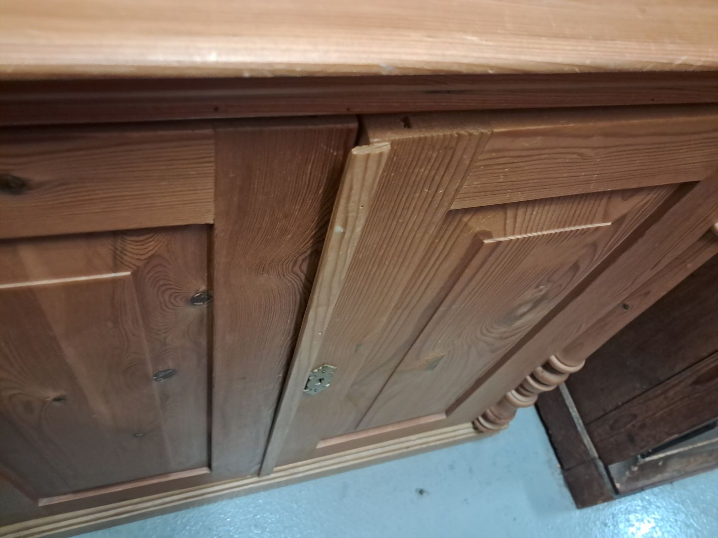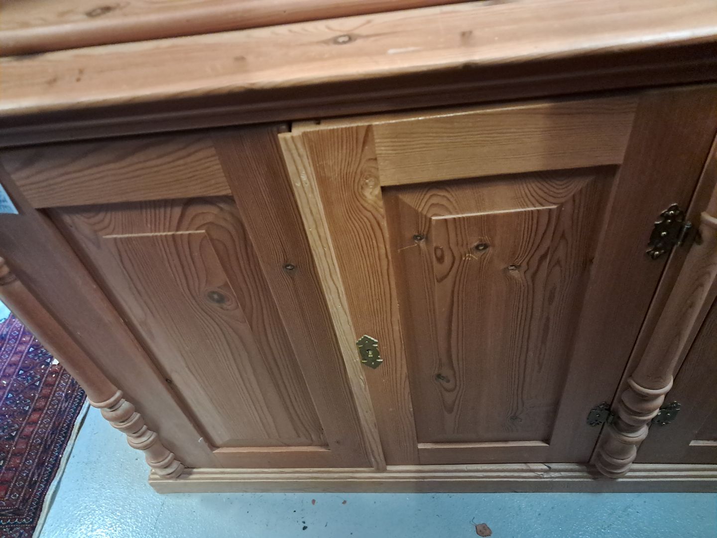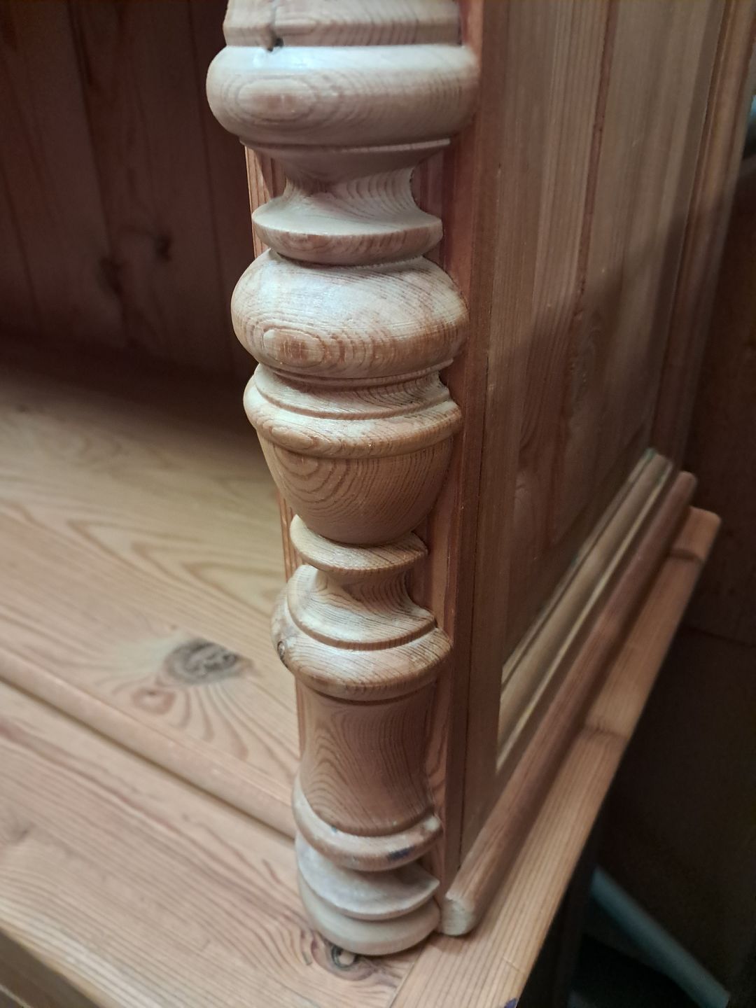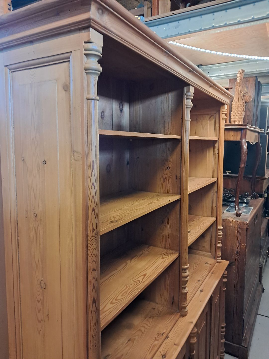 Skab med reol overdel i massivt fyrretræ, fra 1980erne. Det har brugsspor og lågerne gaber en lille smule. Højde 212cm Bredde 167cm Dybde 42cm Emne nummer: 77431