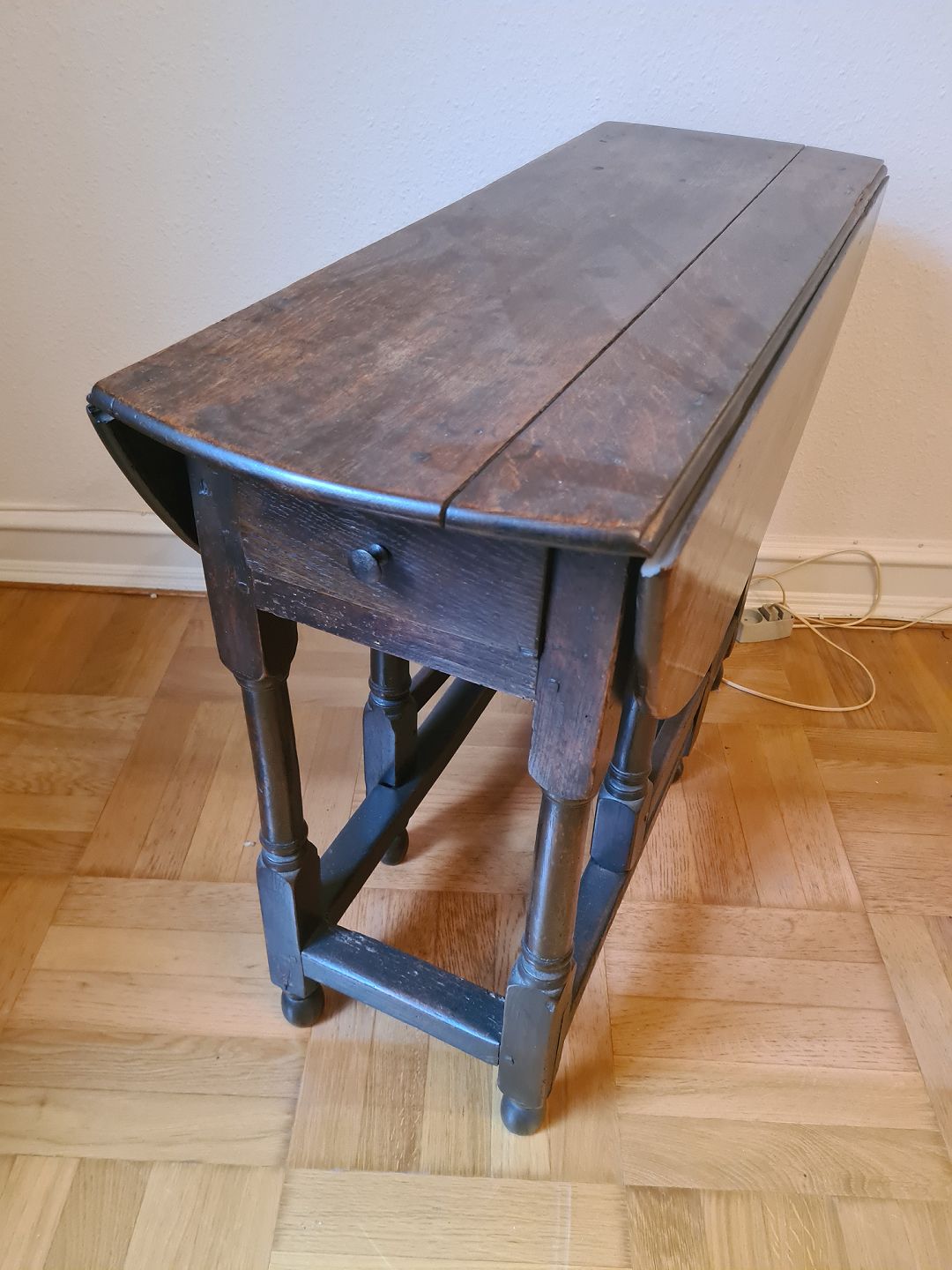 Klapbord fra 1800 tallet i eg og med skuffe. Pænt, velholdt og udmærket funktionsdygtigt. Højde 70 cm. Længde 87 cm. Bredde 34 cm. Fuld længde 98 cm. Emne nummer: 93006