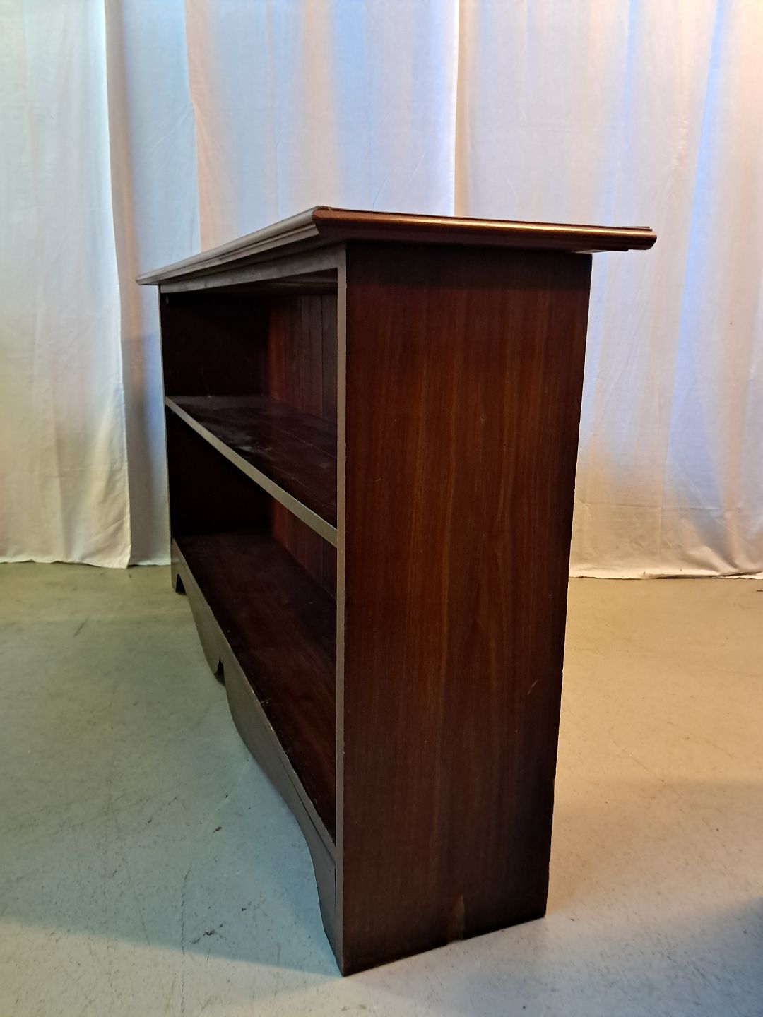 Reol i fineret mahogni, fra 1910erne. Den har brugsspor. Højde 80cm Bredde 148cm Dybde 35cm Emne nummer: 77450