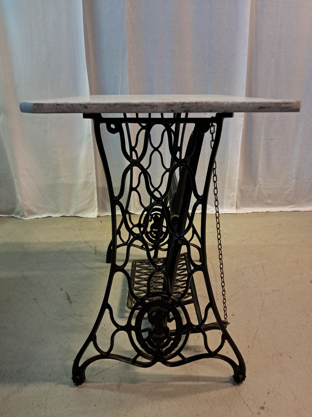 Singer symaskine-understel i metal med marmorplade, fra 1920erne. Det har brugsspor. Højde 74cm Bredde 75cm Dybde 52cm Emne nummer: 77456