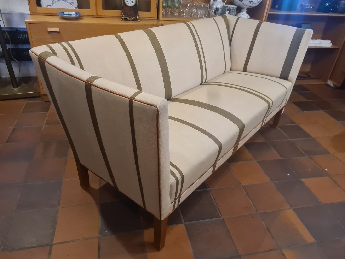 Grete Jalk overpolstret 2. Pers. Sofa model JH165 udført hos Snedkermester Johannes Hansen ca. 1960’erne. Fremstillet i Savak uld med lys læder kædder samt ben af eg. Pæn brugt stand. Mål: H. 75 cm. L. 165 cm. D. 70 cm. SH. 41 cm. Emne nummer: 80907
