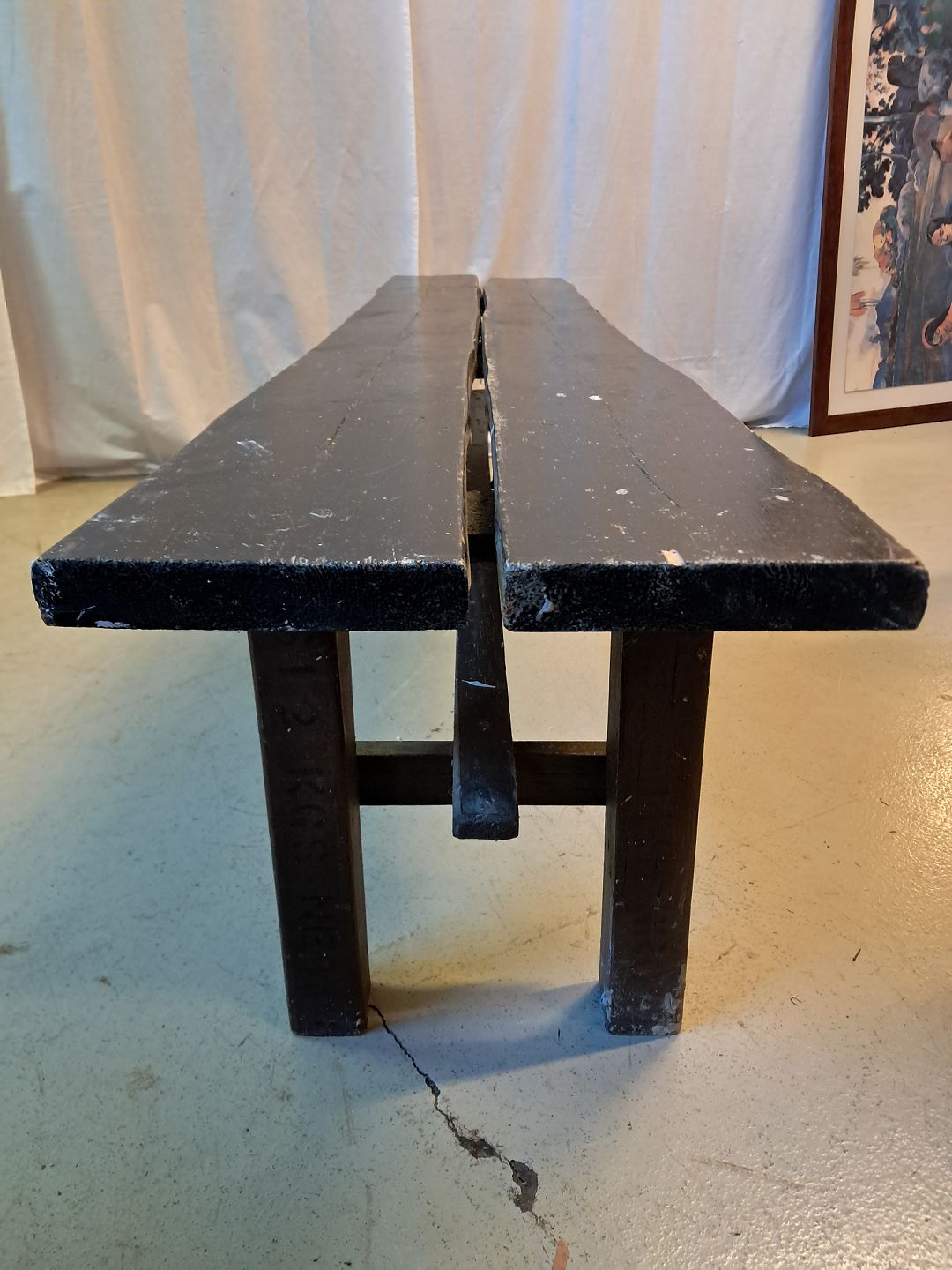 Malet bænk i massivt Fyrre og egetræ, fra 1950erne. Den har brugsspor. Højde 44cm Bredde 38cm Længde 195cm Emne nummer: 77527