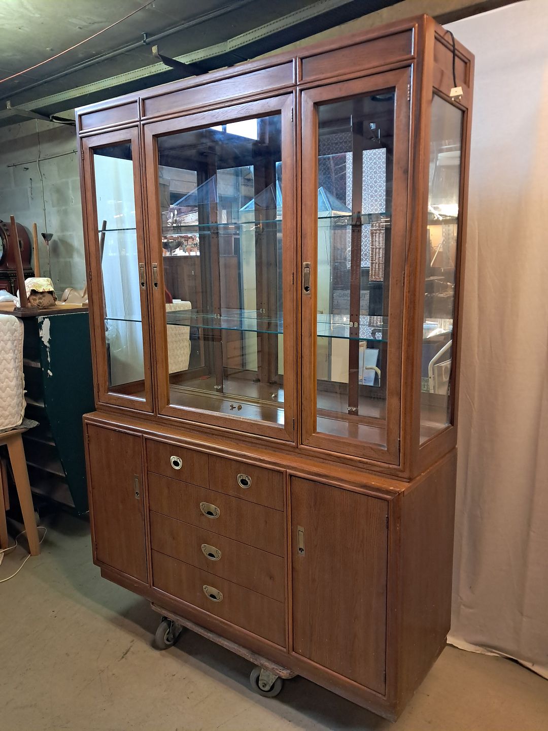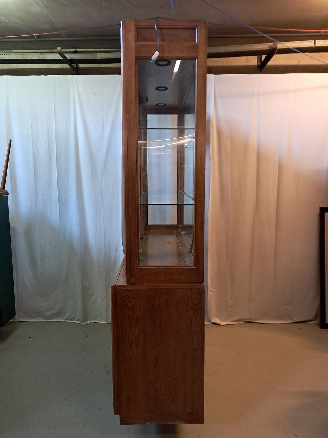 Amerikansk skab i fineret egetræ med glasoverdel, fra 1990erne. Det har brugsspor. Højde 203cm Bredde 147cm Dybde 48cm Se emne nr. 77535 Emne nummer: 77533