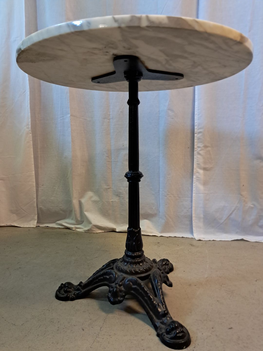 Bord i malet metal med marmorplade, fra 1990erne. Det har brugsspor. Højde 67cm Diameter 60cm Emne nummer: 77555