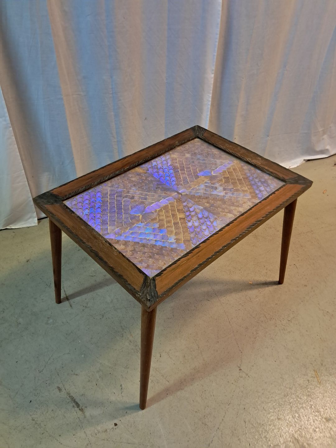Sofabord i massivt bøgetræ med glasplade og sommerfuglevinger, fra 1980erne. Det har brugsspor. Højde 52cm Bredde 50cm Længde 70cm Emne nummer: 77607