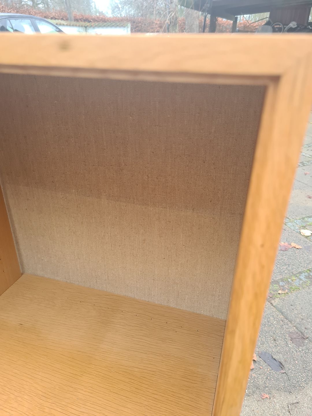 Reol i finéret eg med underskab og hessian beklædt bagbeklædning. Ydført hos HG Funiture i 1970'erne. Fremstår pæn og velholdt uden de store brugsspor. Højde 112 cm. Bredde 101 cm. Dybde 36 cm. Emne nummer: 80922