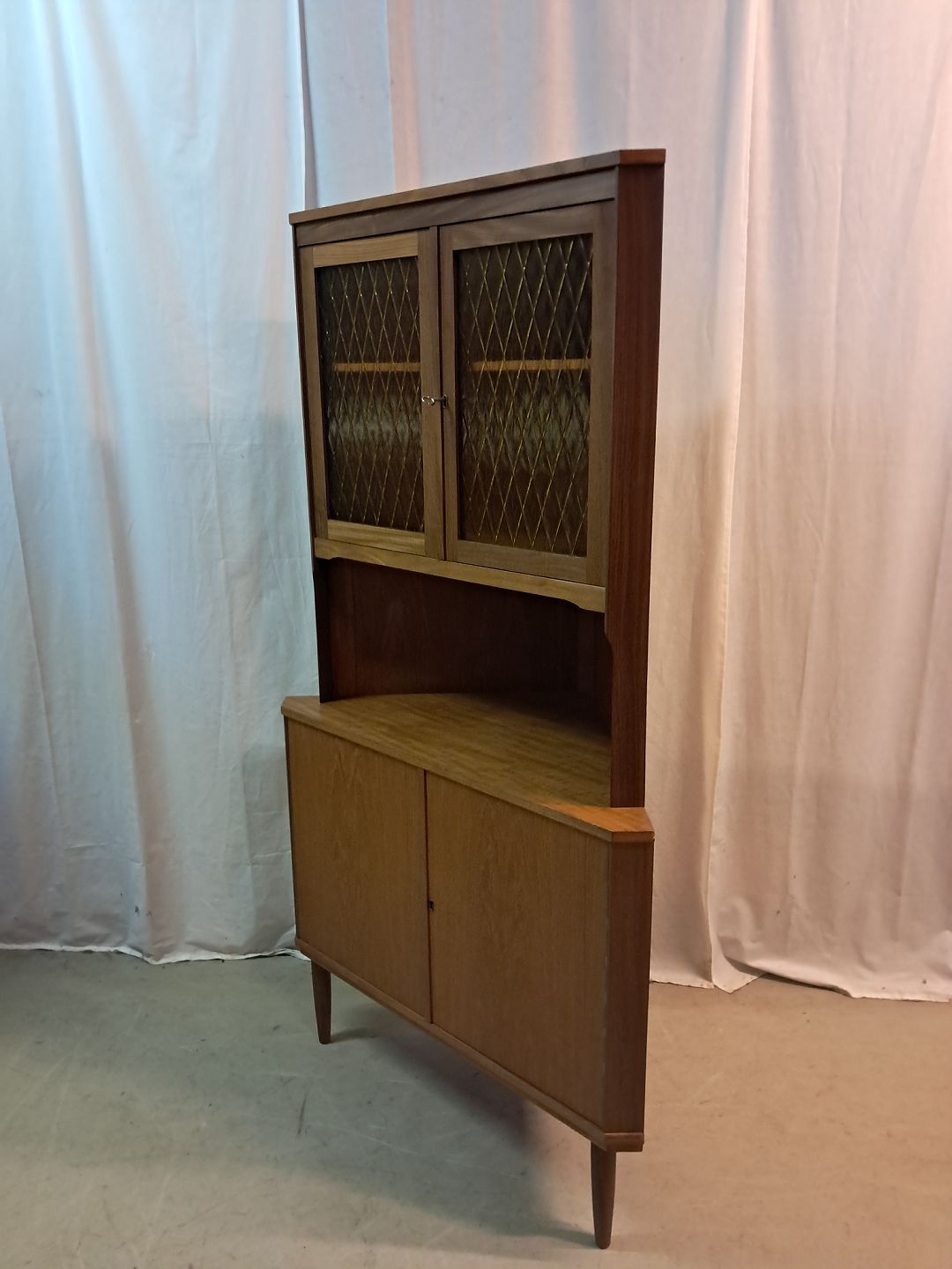 Hjørneskab i fineret teaktræ, fra 1960erne. Det har brugsspor. Højde 163cm Bredde 87cm Dybde 61cm Emne nummer: 77674