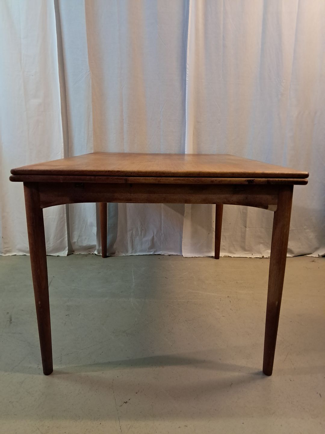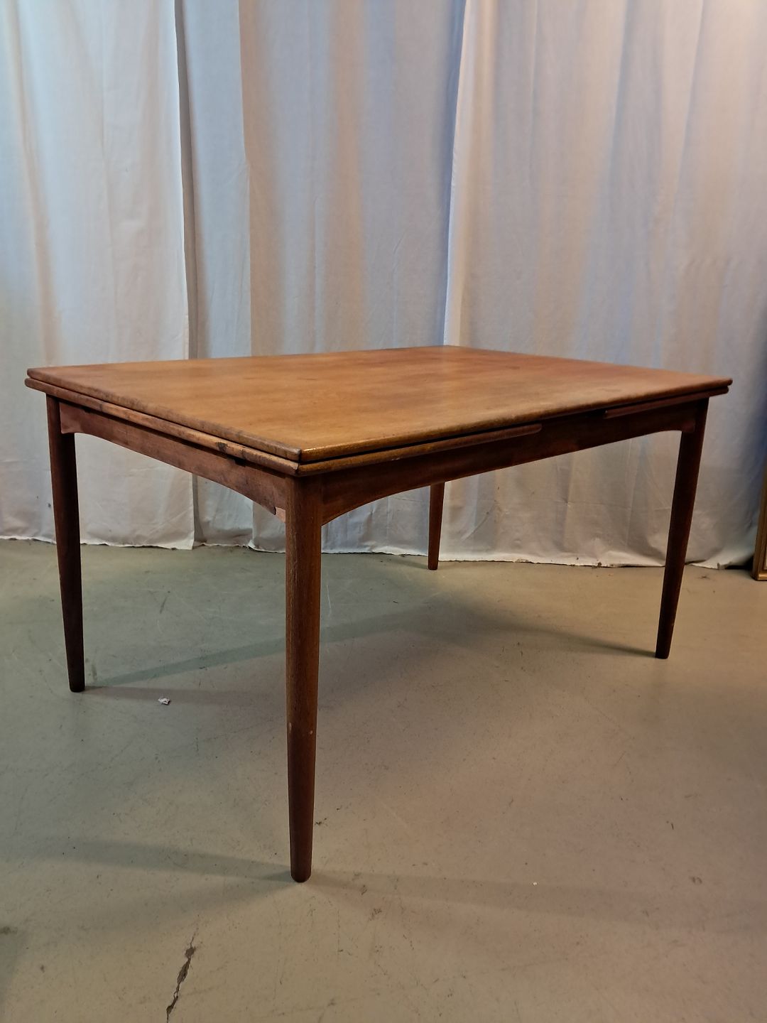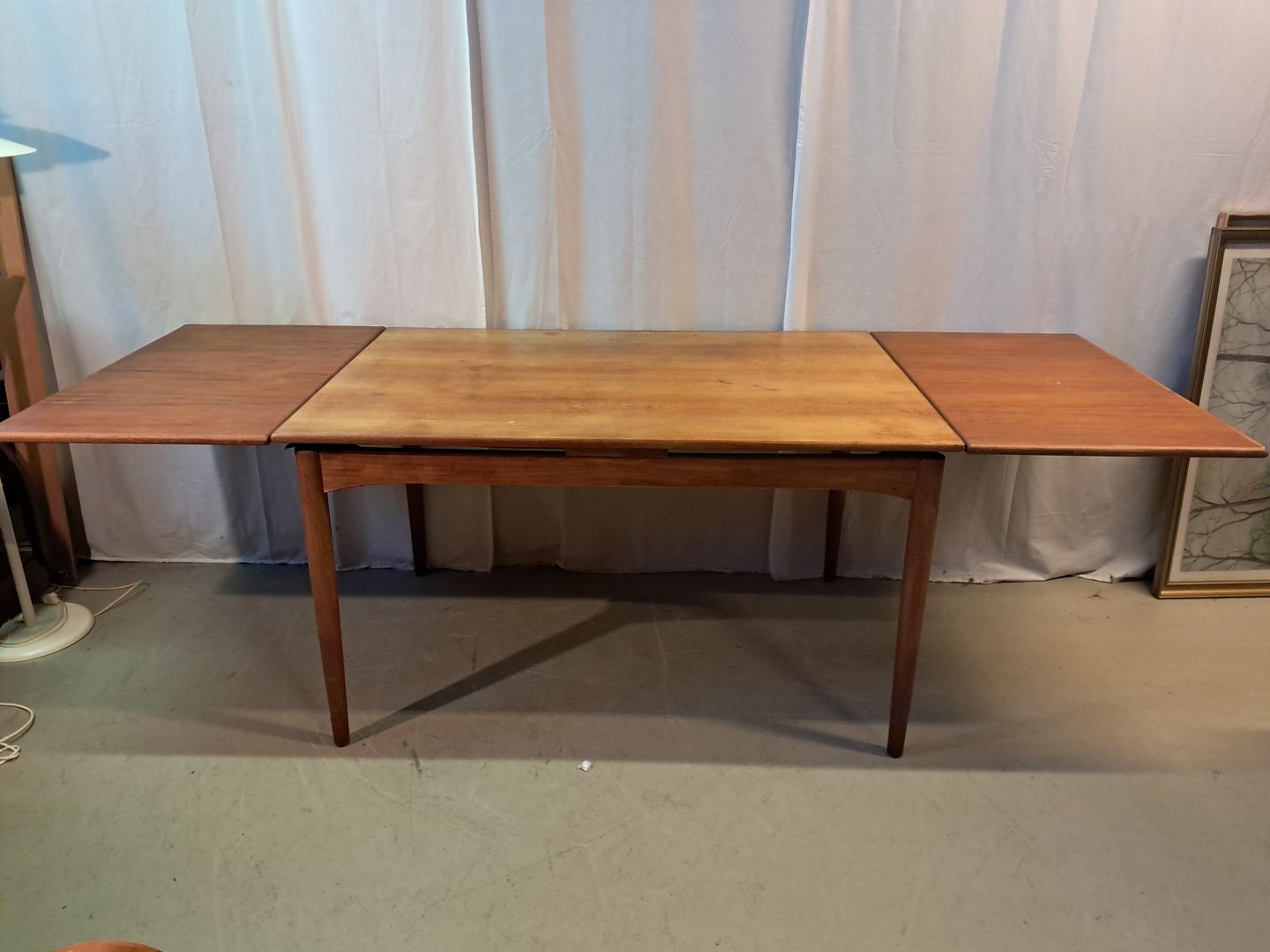 Spisebord i fineret teaktræ med hollandsk udtræk, fra 1960erne. Det har brugsspor og finer defekt. Højde 74cm Bredde 90cm Længde 130cm Længde med udtræk 240cm Emne nummer: 77677