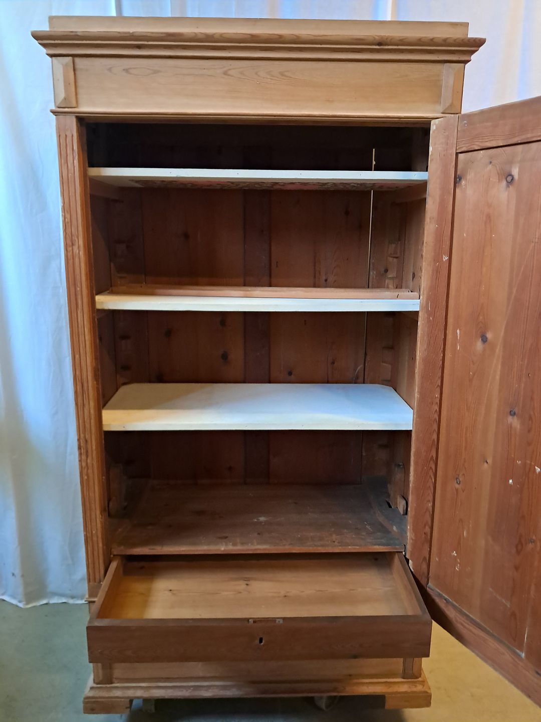 Karlekammerskab i massivt fyrretræ, fra 1910erne. Det har brugsspor. Højde 180cm Bredde 100cm Dybde 50cm Emne nummer: 77689