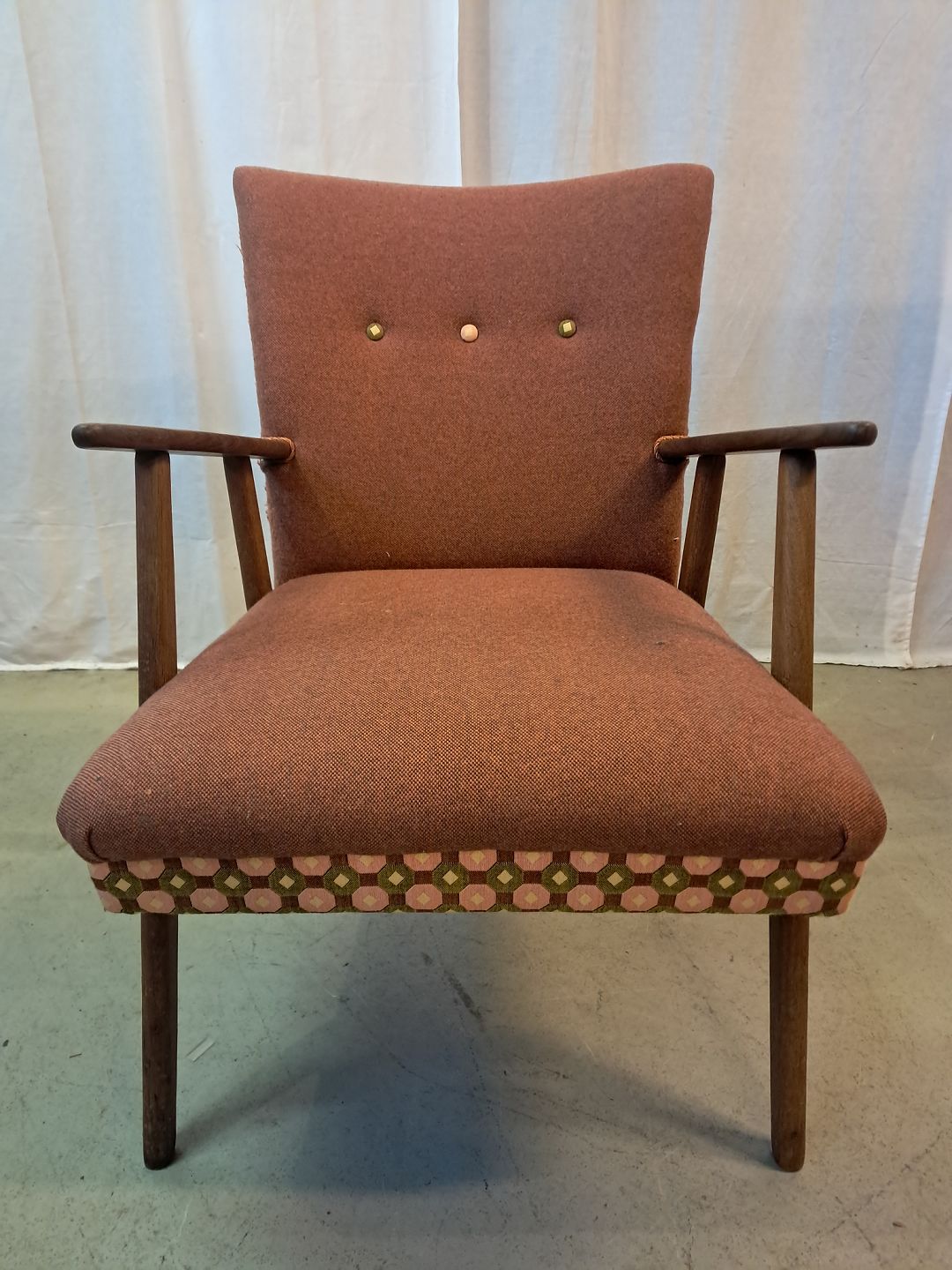 Lænestol i teaktræ med stofbetræk, fra 1960erne. Den har brugsspor og der er slid på den ene side. Ryghøjde 80cm Sædehøjde 42cm Emne nummer: 77735