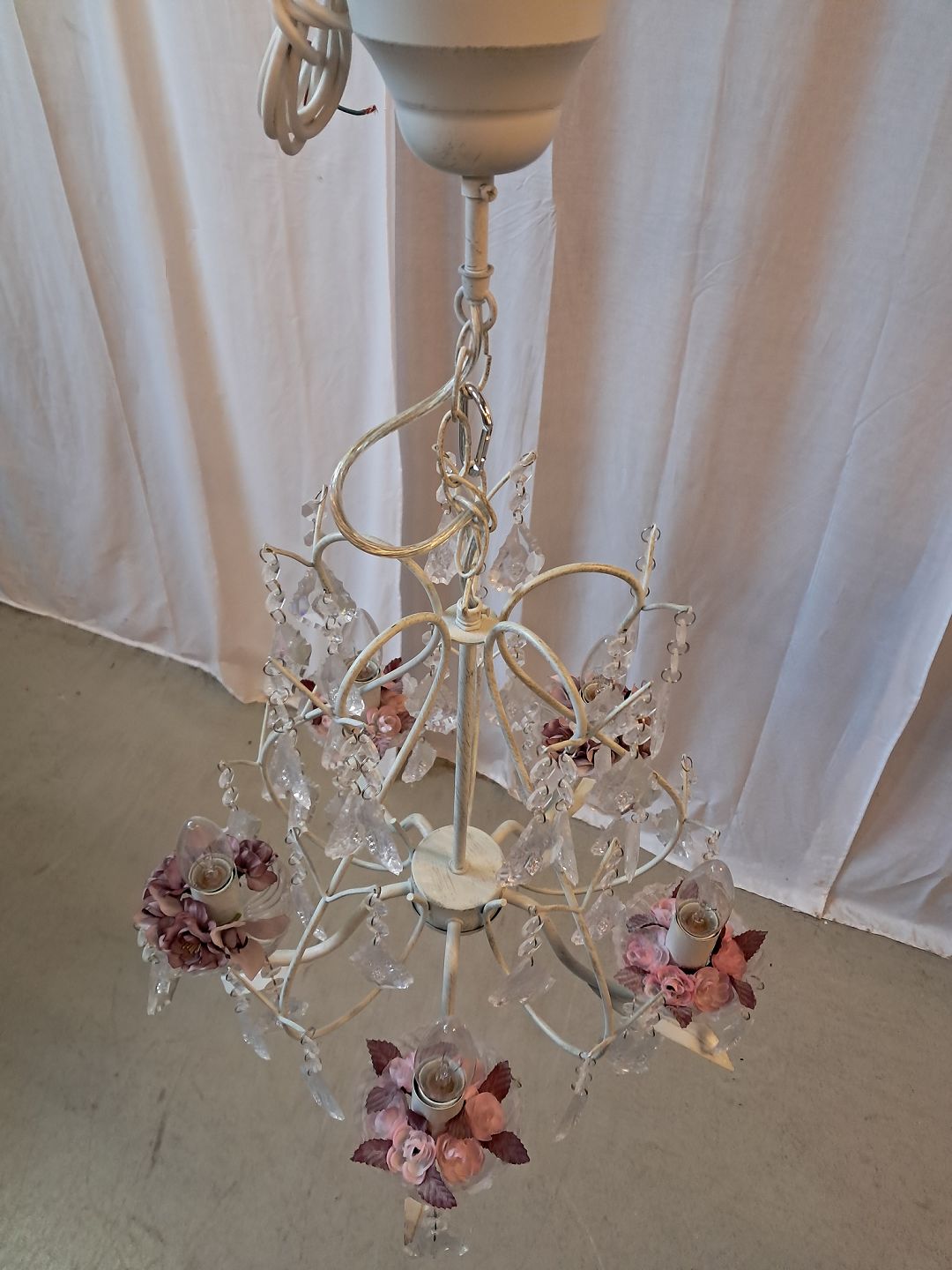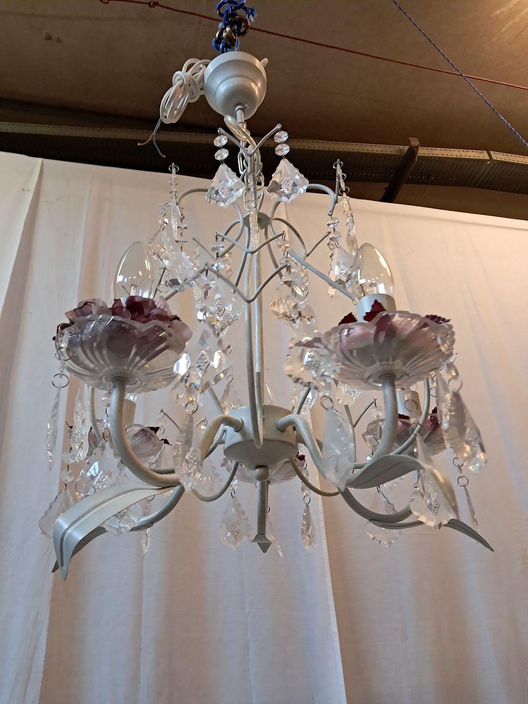 Malet lysekrone i metal med plastprismer, fra 1990erne. Den har brugsspor. Højde 70cm Diameter 42cm Emne nummer: 77747