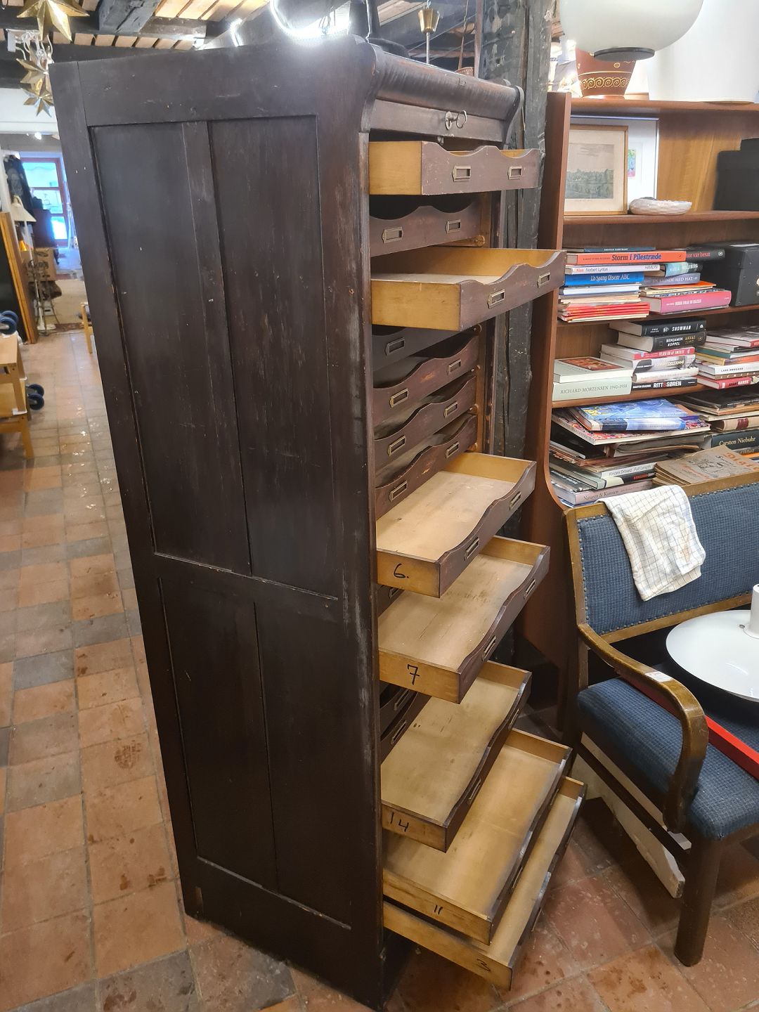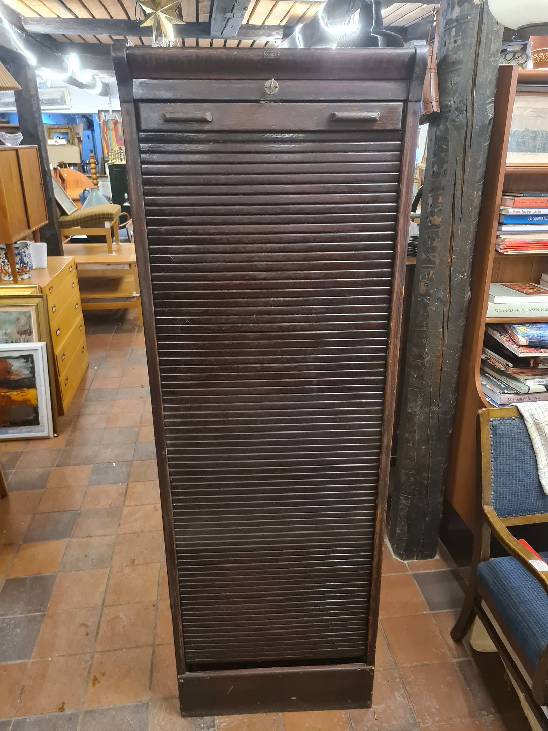 Ældre arkivskab m. jalousilåge, udført i mørk bejdset egetræ. Fremstillet i Danmark ca. år 1920. Fremstår i brugt stand, mindre huller i siden. Se foto. Semi defekt lås. Mål: H. 181 cm. B. 59 cm. D. 56 cm. Emne nummer: 81018