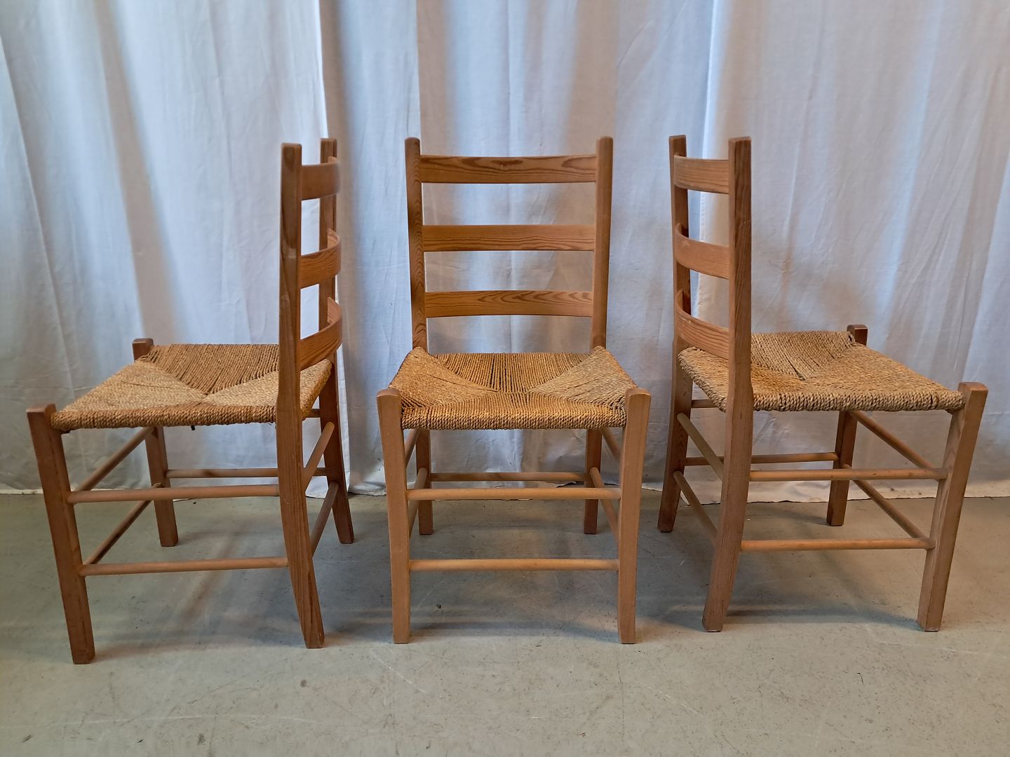 3 Stole i massivt fyrretræ, fra 1980erne. De har brugsspor. Ryghøjde 86cm Sædehøjde 43cm Emne nummer: 77772