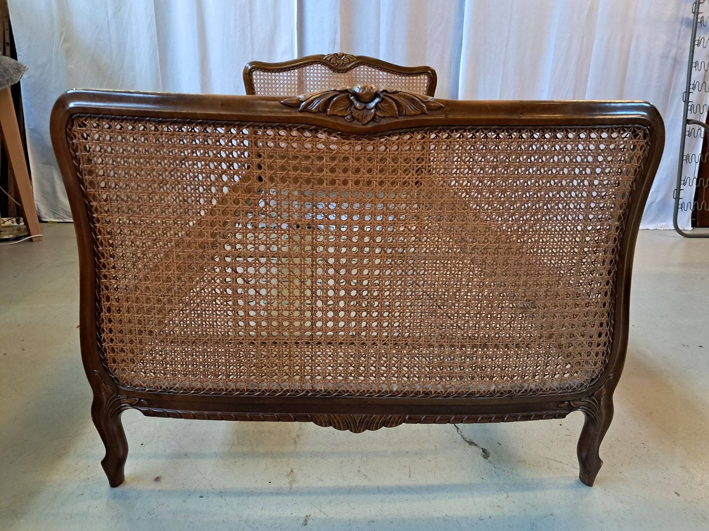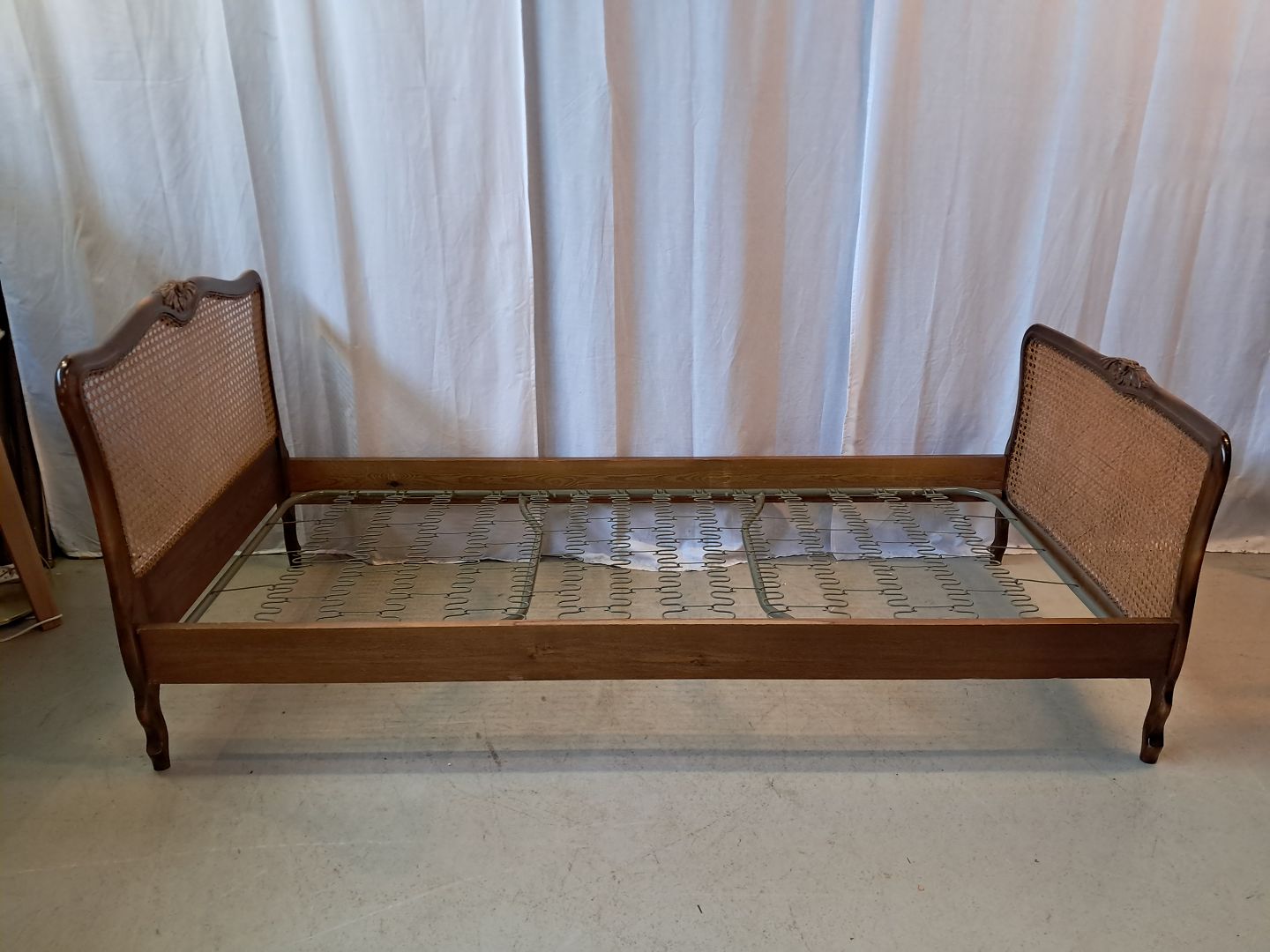 Seng i nødetræ med rørflet, fra 1950erne. Den har brugsspor og der medfølger ikke madras. Gavlhøjder 87cm og 69cm Bredde 93cm Længde 195cm Madras mål : 85cm X 190cm Emne nummer: 77773