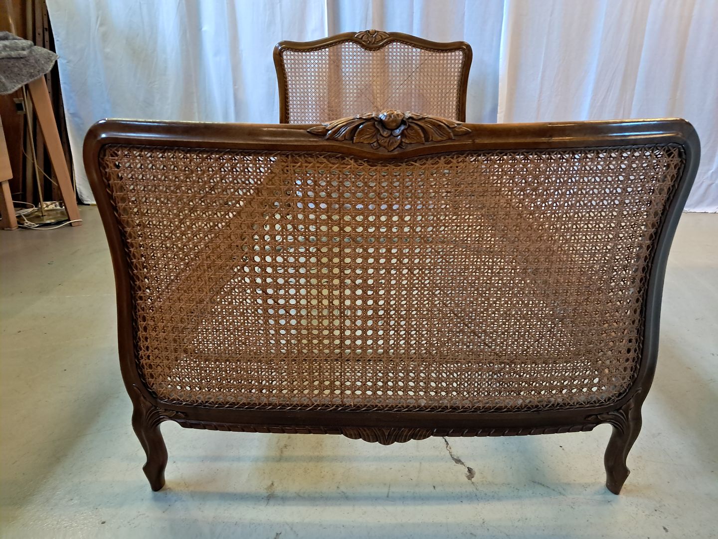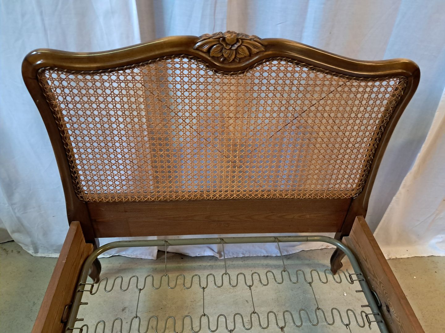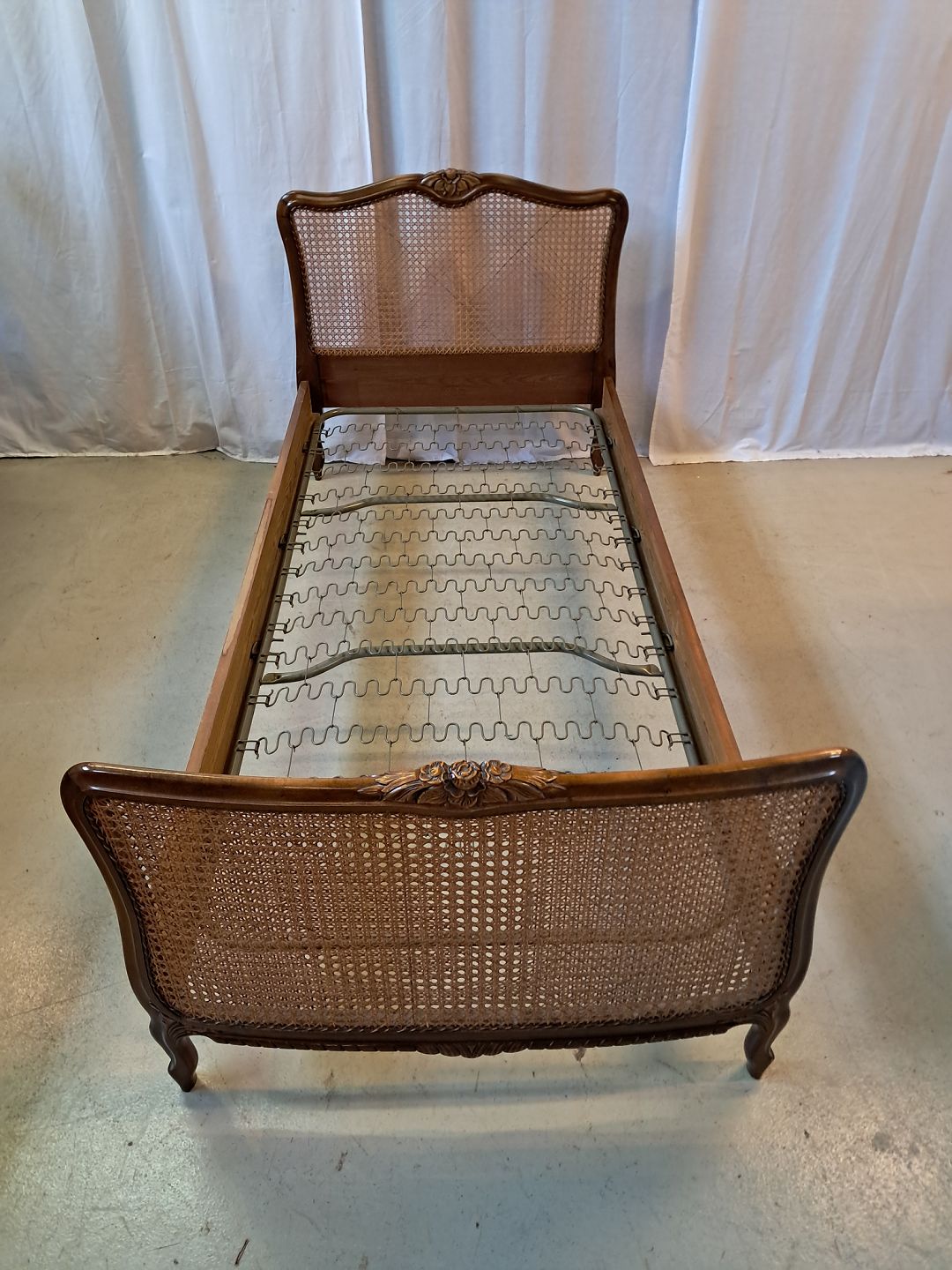 Seng i nødetræ med rørflet, fra 1950erne. Den har brugsspor og der medfølger ikke madras. Gavlhøjder 87cm og 69cm Bredde 93cm Længde 195cm Madras mål : 85cm X 190cm Emne nummer: 77774