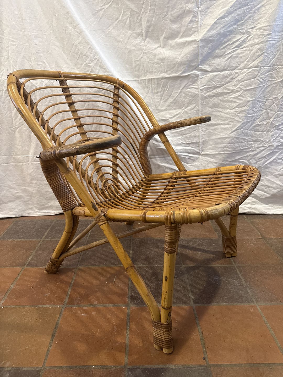 Dansk møbelproducent kurvestol i bambus. Fremstillet ca. 1930'erne. Brugt stand, fremstår med brugsspor. Mål: H. 70 cm. B. 68 cm. D. 75 cm. SH. 37 cm Emne nummer: 81063