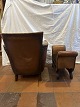Otto Schulz lænestol i søm beslået patineret skind m. pude i stof. Samt tilhørende skammel i søm beslået skind m. sæde i velour betræk.