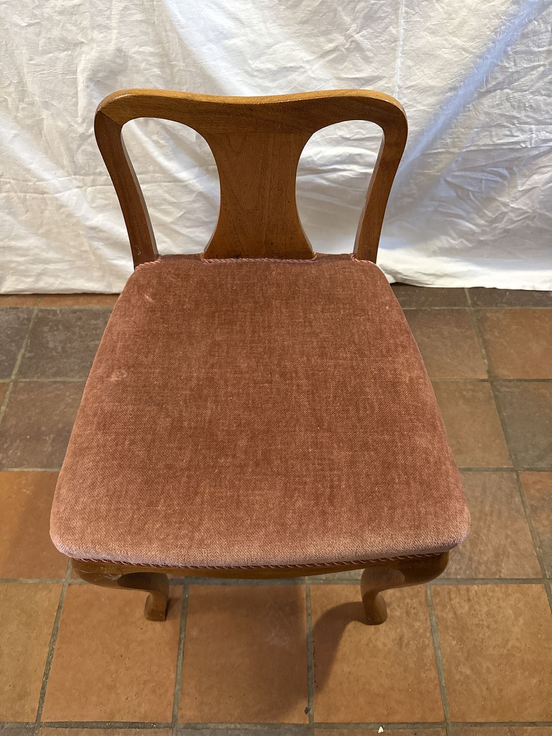 Ukendt formgiver lav rygget stol i lakeret mahogni m. sæde i velourstof. Fremstillet ca. 1920'erne. Pæn brugt stand. Mål: H. 65 cm. B. 41. cm. D. 44 cm. SH. 44 cm. Emne nummer: 81077