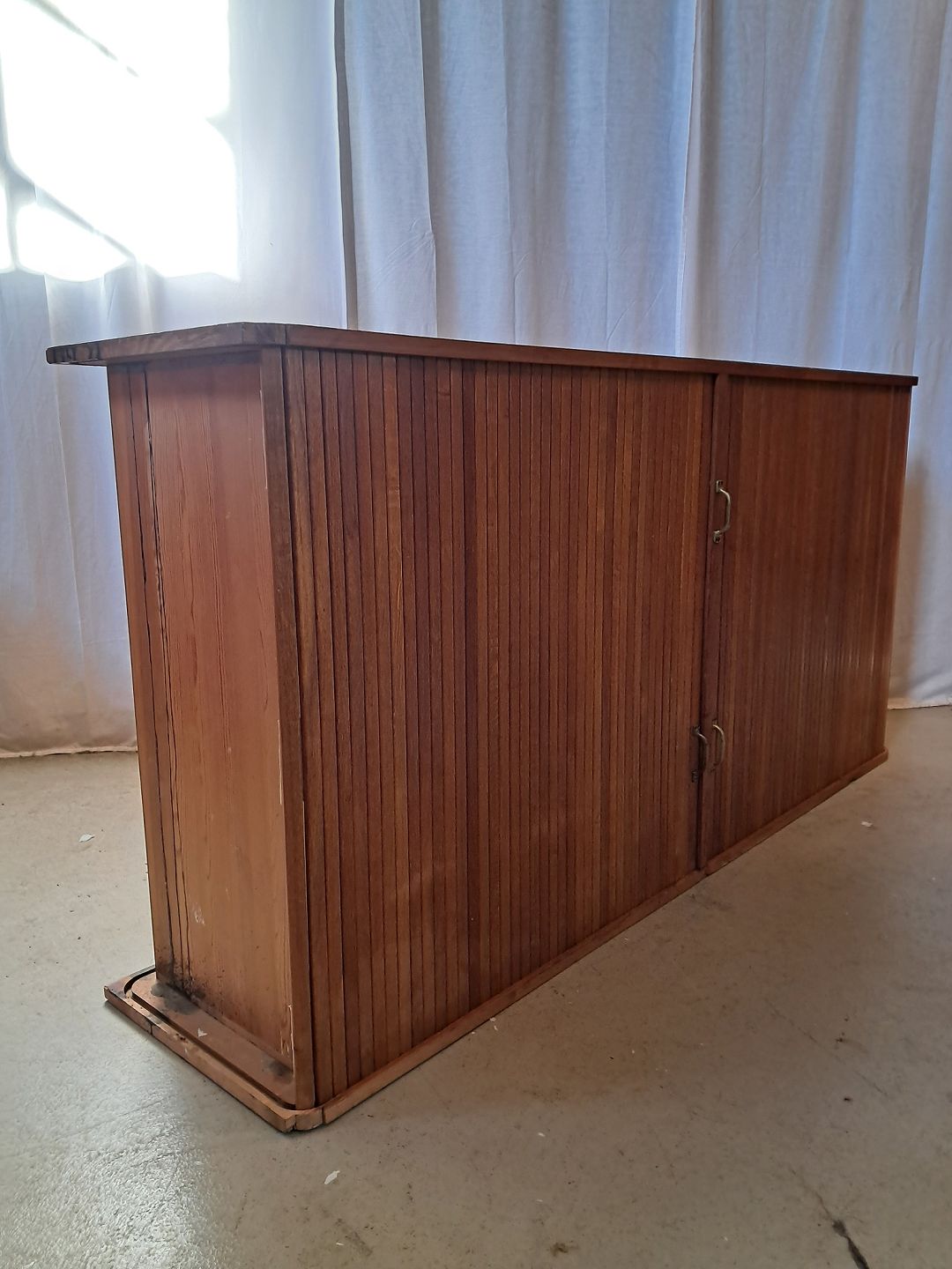 Jalousiskab i fineret egetræ, fra 1950erne. Det har brugsspor og defekter. Højde 89cm Bredde 180cm Dybde 44cm Se emne nr. 77815 og 77884 Emne nummer: 77814