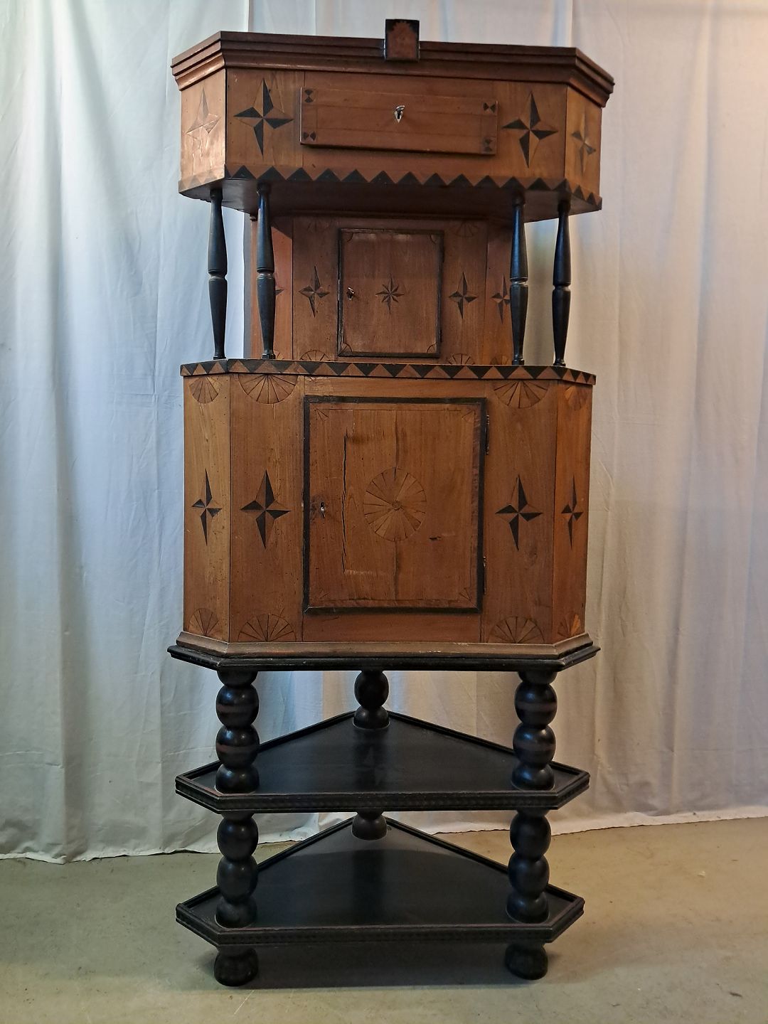 Hjørneskab i ege og elmetræ, det har 200 års jubilæum Det har brugsspor. Højde 188cm Bredde 88cm Dybder 65cm Emne nummer: 77820