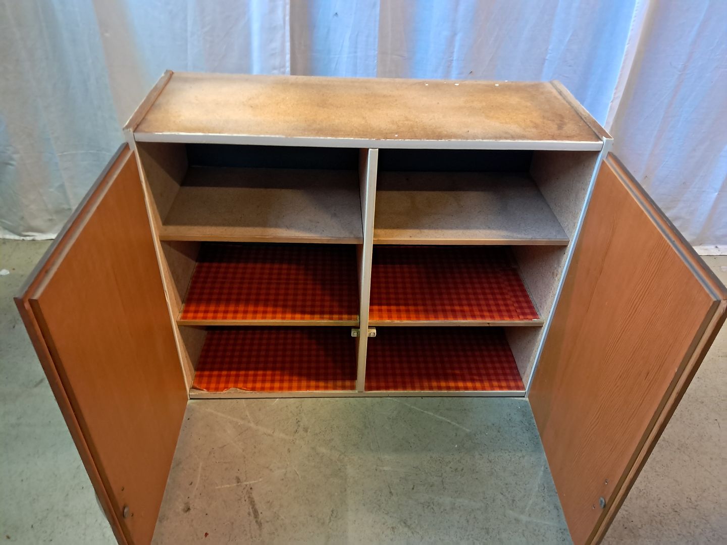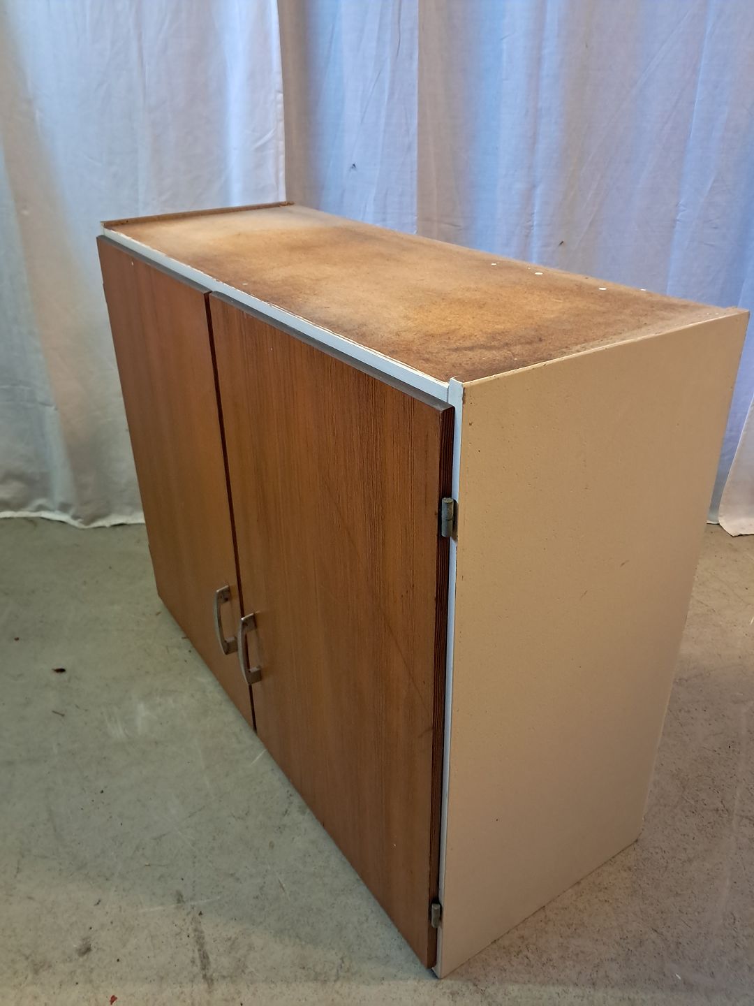 Gammelt malet køkkenskab med låger i origon pine, fra 1960erne. Det har brugsspor. Højde 64cm Bredde 79cm Dybde 31cm Se emnr nr. 77828 Emne nummer: 77829