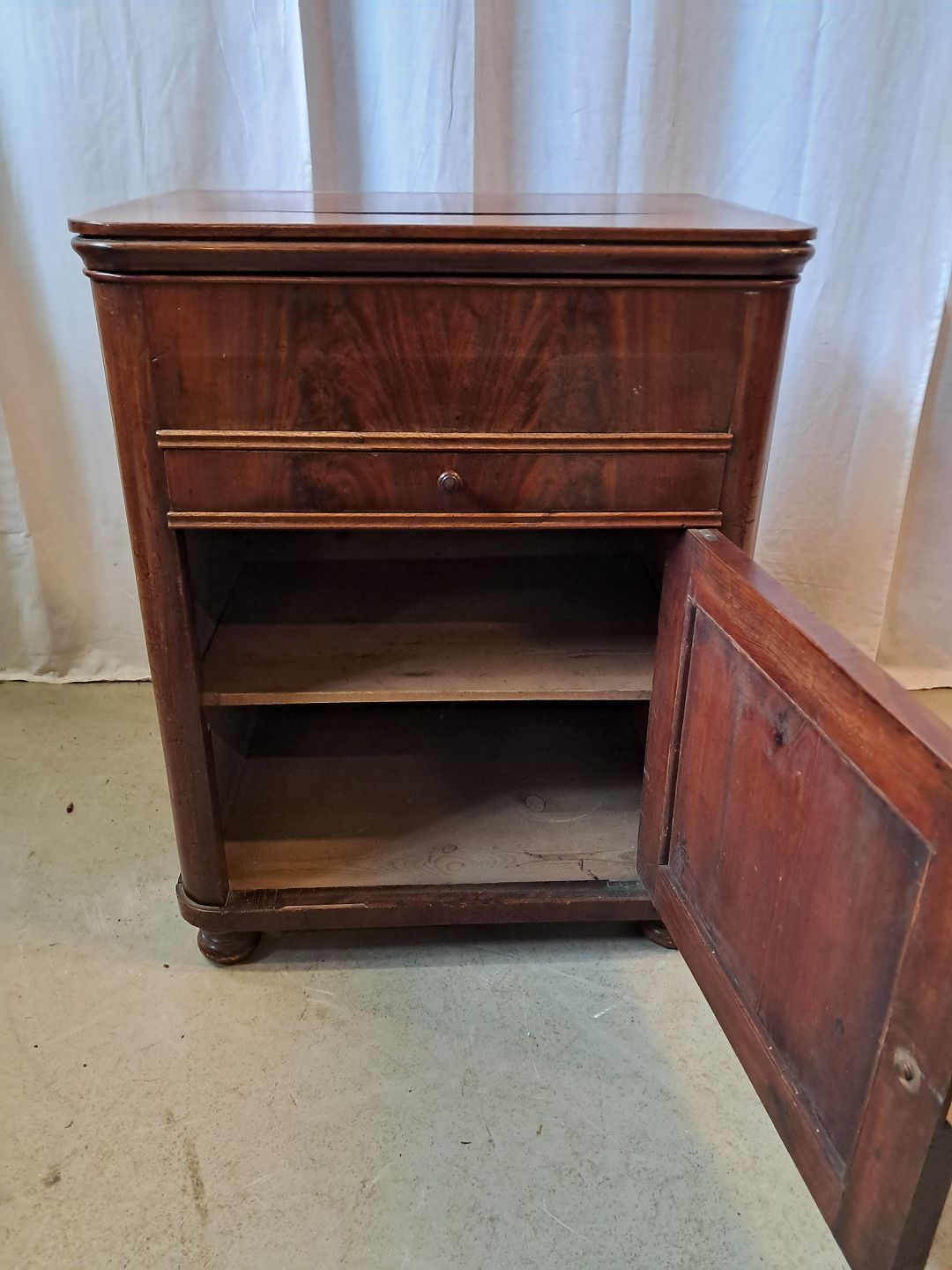 Servante i fineret mahogni, fra 1910erne. Den har brugsspor og en revne i toppladen. Højde 76cm Bredde 60cm Dybde 44cm Emne nummer: 77839