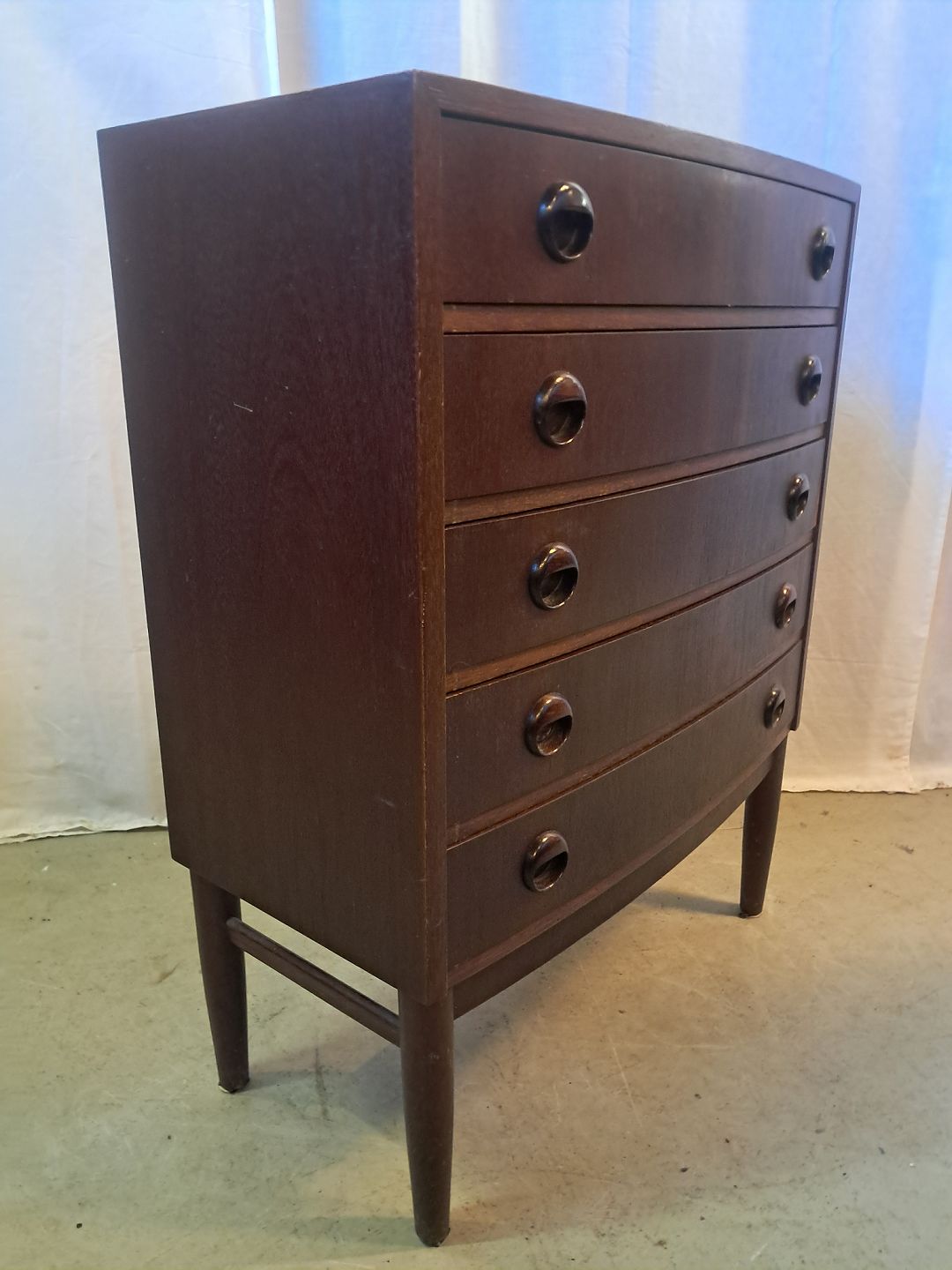 Kommode i bejdset fineret rgrtræ, fra 1960erne. Den har brugsspor og en fineret defekt. Højde 77cm Bredde 60cm Dybde 31cm Emne nummer: 77862