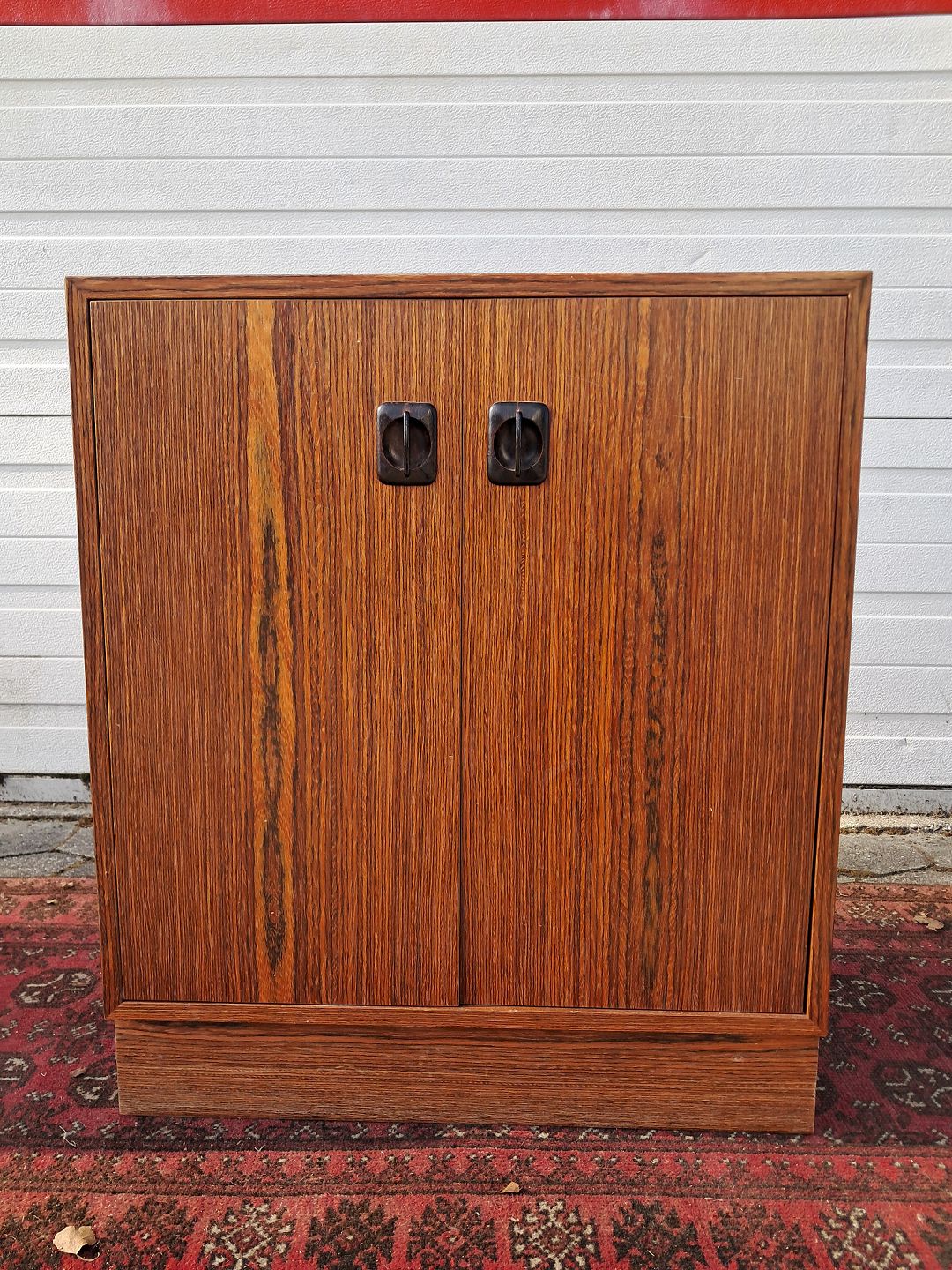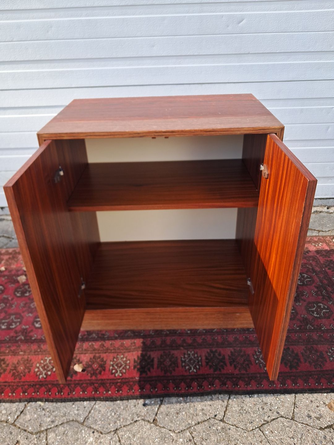 Skab i fineret palisander, fra 1970erne. Det har brugsspor. Højde 71cm Bredde 60cm Dybde 40cm Emne nummer: 77896