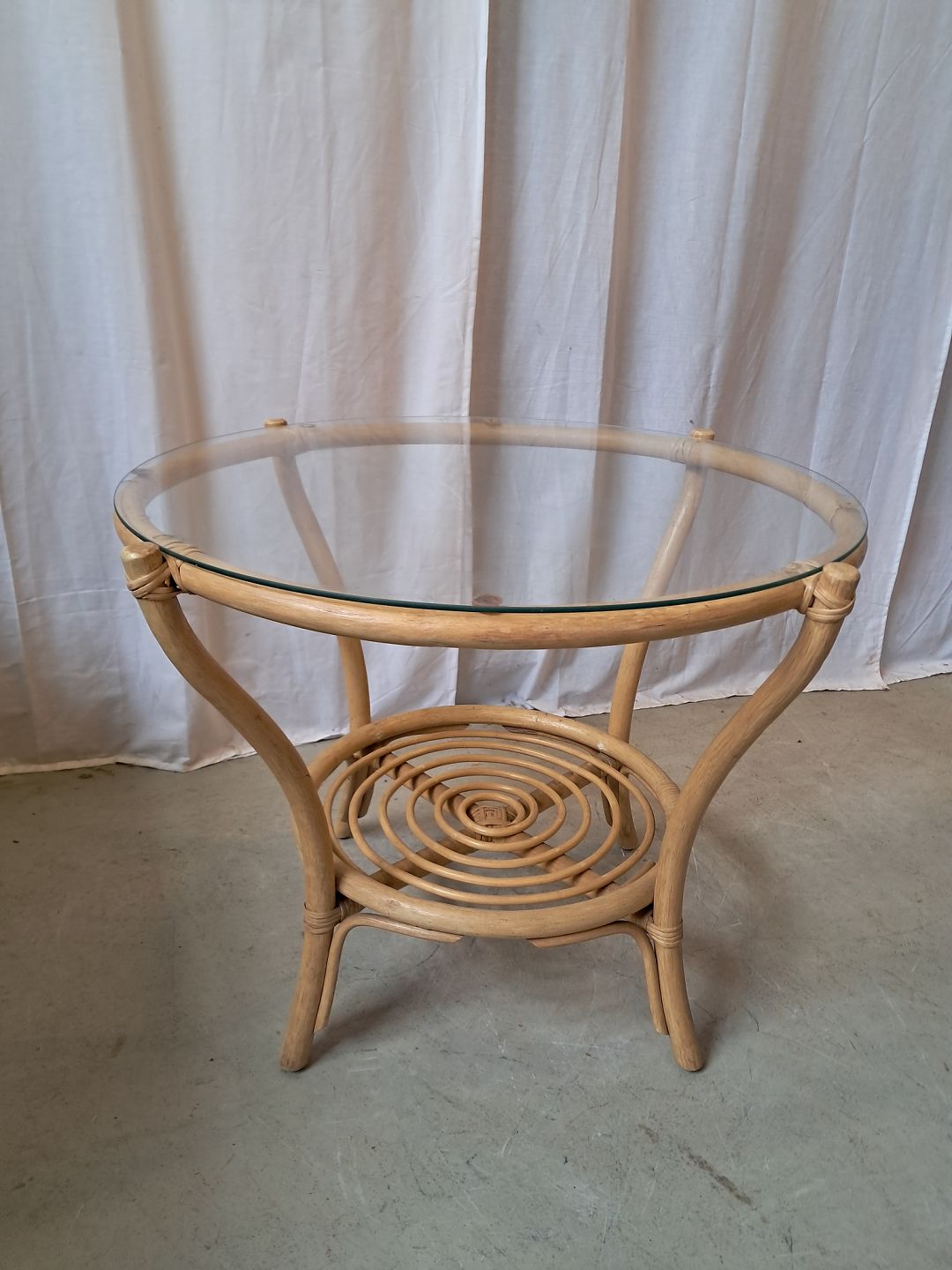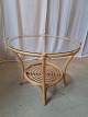 Bord i bambus med glasplade, fra 1990erne. Det har brugsspor. Højde 58cmcm Diameter 76cm Emne nummer: 77924