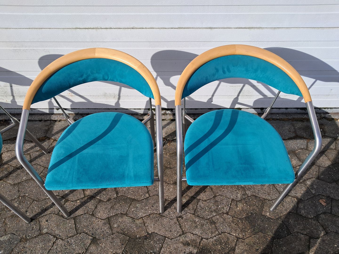 4 Chairman stole af Henrik Tengler i metal med turkis stofbetræk, fra 2000erne.